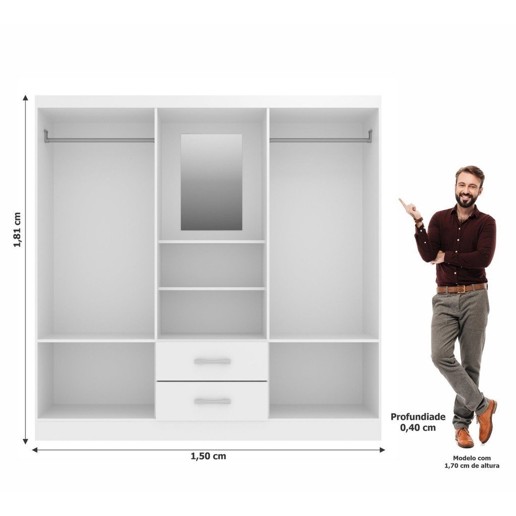 O Guarda Roupa Capelinha Evidência com 4 portas e 2 gavetas, sendo as gavetas espaçosas, 2 prateleiras internas e duas prateleiras externas, dois cabideiros e um espelho, puxador das gavetas e portas em plástico, possui um nicho, produto ideal para quem está procurando algo boa distribuição de espaço e excelente preço não esquecendo da qualidade. Estilo: Clássico Modular: Não Peso (kg): 73 Garantia: 03 Meses Altura (cm): 181 Acabamento: Laca Largura (cm): 150 Possui Pés: Não Possui Gancho: Não Possui Portas: Sim Tipo de Porta: Bater Possui Gavetas: Sim Suporta Até (kg): 100 Tipo de Gaveta: Externa Possui Espelhos: Sim Profundidade (cm): 40 Escala de Brilho: Fosco Possui Calceiros: Não Possui Sapateira: Não Serviço Montagem: 114259443 Material da Porta: MDP Origem do Produto: Nacional Possui Cabideiros: Sim Possui Iluminação: Não Ambiente Principal: Quarto Formato do Espelho: Quadrado Material da Gaveta: Eucalipto Material Principal: MDP Possui Penteadeira: Não Possui Prateleiras: Sim Acabamento da Porta: Laca Nicho com Cabideiro: Não Possui Painel de TV: Não Acabamento da Gaveta: Laca Tipo de Guarda-roupa: Casal Espessura do Fundo (mm): 3 Material da Prateleira: MDP Peso Máximo por Gaveta: 10 Possui Espelho Interno: Não Quantidade de Espelhos: 1 Espessura das Portas (mm): 15 Acabamento da Prateleira: Laca Tipo de Puxador da Porta: Externo Escala de Brilho da Porta: Fosco Espessura da Estrutura (mm): 12 Tipo de Puxador da Gaveta: Externo Escala de Brilho da Gaveta: Fosco Peso Máximo por Prateleira: 5 Tipo de Fixação do Espelho: Presilhas Tipo de Corrediça da Gaveta: Plástica Espessura das Prateleiras (mm): 12 Material do Puxador da Porta: Plástico Possui Organizador de Gaveta: Não Material do Puxador da Gaveta: Plástico Escala de Brilho da Prateleira: Fosco Espessura do Fundo das Gavetas (mm): 3 Possui Espaço para Vestidos Longos: Sim Tipo de Dobradiça/Corrediça da Porta: Simples Marca: Evidência Móveis Cor Flex: Não Cor Interna: Branco Cor do Produto: Branco Itens Inclusos: 1 Guarda Roupa e Manual de Montagem Cor Predominante: Branco Linha ou Coleção: Capelinha Quantidade de Cabideiros: 02 Cabideiros Quantidade de Prateleiras: 04 Prateleiras Quantidade de Portas: 4 Portas Quantidade de Gavetas: 02 Gavetas