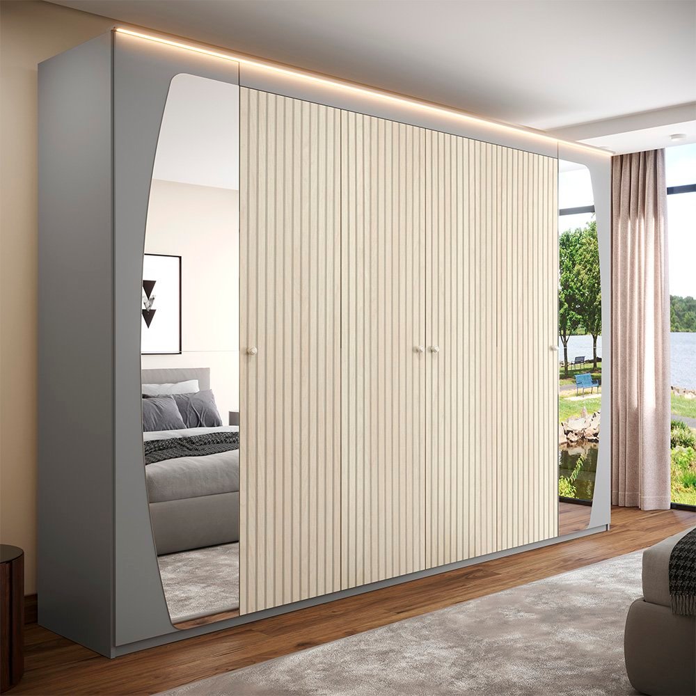 Guarda Roupa Casal com Efeito Ripado, Espelho e LED 6 Portas 6 Gavetas Inovação 100% MDF Cinza/Off White Ripado