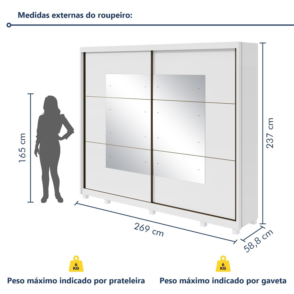 Se você busca organização e um toque de sofisticação, o guarda roupa com espelho é a escolha certa. Ideal para quem precisa de um móvel funcional, ele reflete a luz e amplia o ambiente, deixando o espaço mais leve e moderno. Por ser um guarda roupa com porta de correr, ele otimiza espaço e oferece amplo espaço interno para você organizar roupas, sapatos e acessórios de forma prática, sem abrir mão do estilo. Posso usar o guarda roupa 3 portas para quem divide quarto? Sim, ele é espaçoso e prático para organizar as roupas de duas pessoas! É seguro para usar como guarda roupa infantil? Claro! Ele tem acabamento seguro, ideal para qualquer idade. Estilo: Moderno Modular: Não Peso (kg): 253 Garantia: 03 Meses Altura (cm): 237 Acabamento: Pintura UV Largura (cm): 269 Possui Pés: Sim Possui Portas: Sim Tipo de Porta: Correr Altura dos Pés: 7 Suporta Até (kg): 100 Tipo de Gaveta: Interna Possui Espelhos: Sim Profundidade (cm): 58.8 Escala de Brilho: Fosco Serviço Montagem: 114259443 Material da Porta: MDF Possui Cabideiros: Sim Acabamento dos Pés: Pintura Ambiente Principal: Quarto Formato do Espelho: Retangular Material da Gaveta: MDF Material Principal: MDF Possui Prateleiras: Sim Acabamento da Porta: Pintura Nicho com Cabideiro: Não Acabamento da Gaveta: Pintura Espessura do Espelho: 3 Tipo de Guarda-roupa: Casal Espessura do Fundo (mm): 2.7 Material da Prateleira: MDF Peso Máximo por Gaveta: 6 Quantidade de Espelhos: 08 Espelhos com Tamanhos Iguais Espessura das Portas (mm): 15 Acabamento da Prateleira: Pintura Tipo de Puxador da Porta: Externo Escala de Brilho da Porta: Brilhante Espessura da Estrutura (mm): 15 Tipo de Puxador da Gaveta: Embutido Escala de Brilho da Gaveta: Fosco Peso Máximo por Prateleira: 6 Tipo de Corrediça da Gaveta: Metálica Telescópica Espessura das Prateleiras (mm): 15 Possui Organizador de Gaveta: Não Escala de Brilho da Prateleira: Fosco Espessura do Fundo das Gavetas (mm): 2.7 Tipo de Dobradiça/Corrediça da Porta: Alumínio Marca: Espresso Móveis Cor: Branco UV Cor do Produto: Branco Itens Inclusos: 1 Guarda Roupa e Manual de Montagem. Cor Predominante: Branco Linha ou Coleção: Toronto Plus Quantidade de Cabideiros: 02 Cabideiros Quantidade de Prateleiras: 08 Prateleiras Quantidade de Gavetas: 06 Gavetas