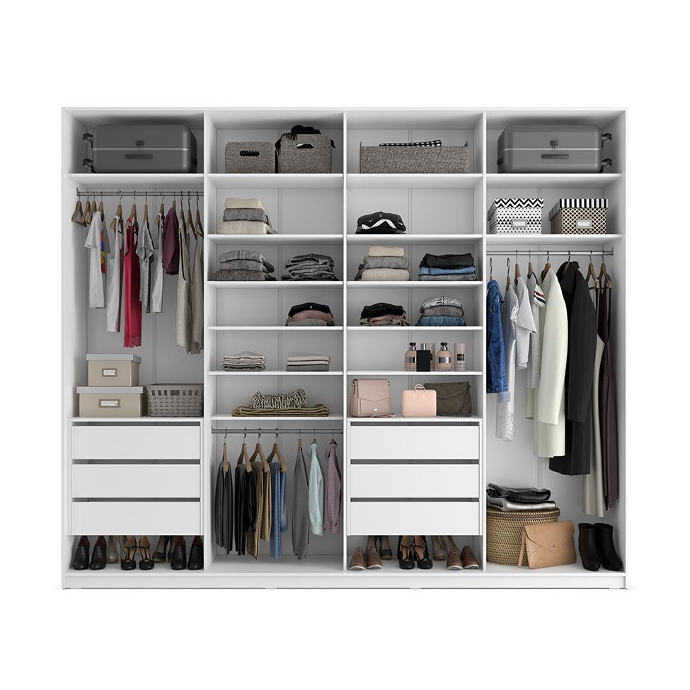 Que tal o Guarda-Roupa Zermatt?Móvel clássico que não pode faltar nos dormitórios, o guarda-roupa é o melhor aliado na hora de organizar e deixar o cômodo com o toque pessoal do morador. O modelo Zermatt traz espaço interno ótimo para guardar todos aqueles itens que você precisa ter rápido acesso durante a rotina, seja o vestuário dobrado nas gavetas, peças delicadas nos cabideiros ou ainda roupas de camas, sapatos e outros acessórios nos nichos. Por fora você ganha o reforço da cor versátil, que tem tonalidade fácil de combinar com o restante do mobiliário, e do espelho que não te deixa perder nenhum detalhe dos looks. Para fechar com chave de ouro, as portas de correr te ajudam a aproveitar muito melhor o espaço do ambiente e trazem um visual clean superelegante. Cor: Branco Garantia em Meses: 3 Cores do Produto: Branco Instruções/Cuidados: Limpar com pano úmido Conteúdo da Embalagem: 1 Guarda-Roupa - Entregue em: 8 Volumes Modelo: Zermatt Número de Volumes: 8 Material: O Guarda-Roupa Zermatt é composto por estrutura 100% em MDF BP 15mm, 4 portas de correr com trilho de alumínio, espelho comum 3mm, puxadores em alumínio, 6 gavetas com corrediças telescópicas, 20 nichos e acabamento fosco Material para Filtro: MDF Descrição do Tamanho: Altura: 235 cm | Largura: 277 cm | Profundidade: 60 cm Altura do Produto (cm): 235 Largura do Produto (cm): 277 Comprimento do Produto (cm): 60 Peso do Produto (Kg): 268 Produto precisa de Montagem?: Sim, sugerimos a contratação do nosso serviço de montagem (para os CEPs em que o serviço está disponível) ou de algum profissional experiente de sua preferência Tipo de Guarda-Roupas: Casal Número de portas: Sem portas Número de gavetas: Sem gavetas Tipo de pé: Não se aplica Número de Prateleiras: Sem Prateleiras Material da dobradiça/trilho da porta: Metal Material da estrutura: MDF Material do cabideiro: Alumínio Material do fundo: HDF Material do puxador: Alumínio Necessita fixação na parede: Não Possui chaves: Não Possui espelho/vidro: Sim Possui Fruteira: Não Tipo da Corrediça da gaveta: Telescópica Tipo de Porta: Correr Material do Tampo: Não se aplica Material dos pés: Não se Aplica PROFUNDIDADE x LARGURA x ALTURA: 60 x 277 x 235 Fornecedor: RR Industria e Comercio de Moveis LTDA Baterias são necessárias?: Não Certificação de teste externa: Não Componentes incluídos: Não Is Fragile: Não Número da peça: Não Inclui manual de montagem: Sim Inclui Manual de Montagem: Sim