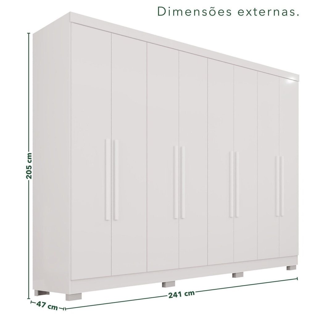 Transforme seu dormitório em um ambiente de organização e estilo com o Guarda-Roupa Casal França. Este móvel é a escolha ideal para quem busca funcionalidade e beleza para acomodar as roupas e acessórios do casal de forma prática. Espaço Otimizado e Organização Interna Projetado para oferecer excelente divisão interna, este guarda-roupa possui seis portas de bater que dão acesso a seis prateleiras espaçosas e cabideiros em alumínio, garantindo lugar para todas as suas peças. O destaque fica para as duas gavetas internas, que contam com corrediças telescópicas para uma abertura total e suave, ideal para organizar itens menores. Qualidade e Dimensões Fabricado em MDP de alta qualidade, o Guarda-Roupa França oferece resistência e durabilidade. O design clean é complementado por puxadores em MDF, assegurando um visual moderno. Com 205 cm de altura, 180 cm de largura e 47 cm de profundidade, ele se encaixa facilmente em diversos estilos de decoração, tornando seu quarto muito mais arrumado e convidativo. Importante: o produto não inclui itens decorativos ou acessórios mostrados nas imagens. Confira o título e a ficha técnica completa para garantir que sua compra seja exatamente o que você espera! Garanta o encaixe perfeito! Planeje seu ambiente com cuidado comparando as medidas do produto com o espaço disponível e reserve uma folga de até 2 cm para posicioná-lo com conforto. Estilo: Moderno Modular: Não Peso (kg): 132 Garantia: 03 Meses Altura (cm): 205 Largura (cm): 241 Possui Pés: Sim Possui Portas: Sim Tipo de Porta: Bater Altura dos Pés: 5 Possui Gavetas: Sim Tipo de Gaveta: Interna Possui Espelhos: Não Profundidade (cm): 47 Gaveta com Chave: Não Material dos Pés: Polipropileno Possui Calceiros: Não Material da Porta: MDP Origem do Produto: Nacional Ambiente Principal: Quarto Material da Gaveta: MDP Material Principal: MDP Possui Prateleiras: Sim Acabamento da Porta: Pintura UV Tipo de Guarda-roupa: Casal Espessura do Fundo (mm): 3 Material da Prateleira: MDP Peso Máximo por Gaveta: 3 Espessura das Portas (mm): 12 Acabamento da Prateleira: Pintura UV Tipo de Puxador da Porta: Externo Espessura da Estrutura (mm): 12 Peso Máximo por Prateleira: 3 Tipo de Corrediça da Gaveta: Metálica Telescópica Espessura das Prateleiras (mm): 12 Material do Puxador da Porta: MDF Possui Organizador de Gaveta: Não Espessura do Fundo das Gavetas (mm): 3 Tipo de Dobradiça/Corrediça da Porta: Telescópica Marca: Espresso Móveis Cor: Branco Cor do Produto: Branco Itens Inclusos: 1 Guarda Roupa, kit ferragens e manual de montagem Linha ou Coleção: França Cor do Puxador: Branco Quantidade de Prateleiras: 07 Prateleiras Quantidade de Portas: 8 Portas Quantidade de Gavetas: 04 Gavetas Quantidade de Portas com Espelhos: Nenhuma