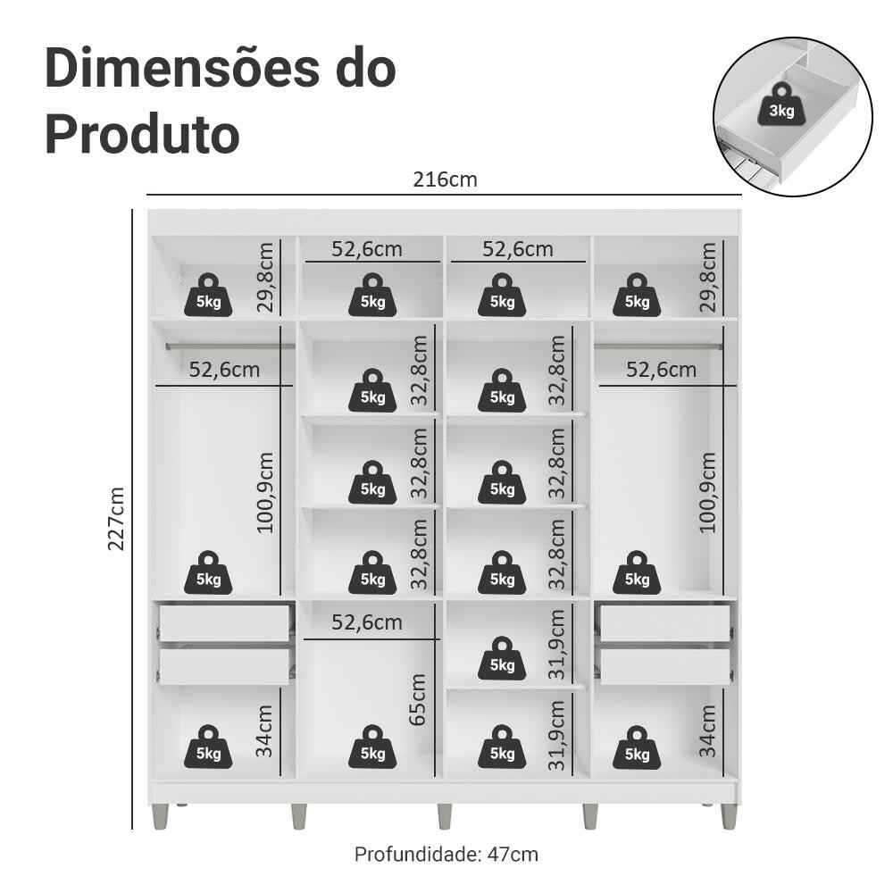 Mais espaço, mais praticidade e mais estilo com o Guarda-Roupa Netuno. As portas contam com dobradiças com amortecimento, garantindo fechamento suave, enquanto as gavetas possuem corrediças que permitem abertura total. O maleiro espaçoso é ideal para itens maiores, e as gavetas e prateleiras ajustáveis permitem personalizar o interior conforme suas necessidades. Além disso, as portas do meio possuem espelho, agregando ainda mais estilo ao seu quarto. A estrutura e as portas são Brancas e os puxadores em tom amadeirado Rustic, combiando com qualquer estilo de decoração. Os puxadores de 80 cm em MDF destacam o design alongado do guarda-roupa, enquanto os pés resistentes em polipropileno elevam o móvel, facilitando a limpeza e valorizando o ambiente. O Guarda-Roupa Netuno é a escolha perfeita para quem busca um móvel funcional, espaçoso e cheio de detalhes que fazem toda a diferença no quarto. Medidas: - 216 cm de largura - 47 cm de profundidade - 227 cm de altura O que você recebe: - Um Guarda-Roupa com oito portas batentes sendo duas com espelho Código do produto: 1107J52E4GL3CP É importante saber: - Imagens meramente ilustrativas. - A Madesa não disponibiliza serviço de montagem. - Por segurança, é obrigatório fixar o móvel na parede. - O produto segue com manual e todas as ferragens necessárias para a instalação. A Madesa possui compromisso com a sustentabilidade. Geramos energia limpa em nossa própria usina, priorizamos fornecedores responsáveis e utilizamos plástico reciclado em nossa produção. Além disso, reinserimos sobras no ciclo de reciclagem e investimos no desenvolvimento de nossos colaboradores e da comunidade. Garantia: Este produto conta com 1 ano de garantia total, sendo 3 meses de garantia legal e 9 meses de garantia contratual. A garantia cobre exclusivamente defeitos de fabricação e vícios ocultos. Não estão cobertos: problemas decorrentes de montagem incorreta, uso inadequado, exposição à umidade, calor ou luz solar direta, modificações no produto ou desgaste natural.