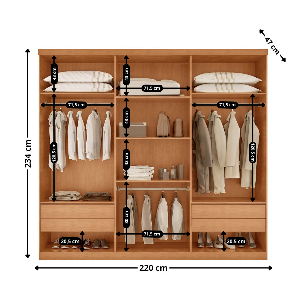 Guarda Roupa Casal Kiev 6 Portas: Se você busca funcionalidade e elegância para o seu quarto, conheça o Guarda-Roupa Kiev. Moderno e alinhado com as últimas tendências de design ripado, ele é a combinação perfeita de sofisticação e praticidade. Suas corrediças telescópicas proporcionam facilidade de uso, transformando seu espaço em um ambiente harmonioso. Encontre tranquilidade e estilo no seu dia a dia com esse guarda-roupa que une beleza e eficiência! Características: Material da Estrutura: 100 MDF Material das Corrediças: Telescópica Material dos Cabideiros: Alumínio Possui espelho: Não Dimensões do Roupeiro: Altura: 234 cm Largura: 220 cm Profundidade: 47 cm Garantia do Fabricante: 03 meses. Informações Importantes: As tonalidades das cores podem sofrer alteração de acordo com a configuração de cada monitor. Os objetos que ambientam as fotos não acompanham o produto. Não disponibilizamos a montagem do produto. Não nos responsabilizamos por danos no produto causado por montagem. Verifique as dimensões do produto e certifique-se que o percurso que ele fará até o local de uso permite sua passagem. Favor verificar o produto no ato da entrega e em caso de problemas decorrentes no transporte (arranhados, quebra, batida, amassados) deve-se efetuar a ressalva na nota fiscal para conhecimento da transportadora e comunicar imediatamente a loja. Moderna Mobília reserva o direito de alterar as especificações técnicas sem prévio aviso. As medidas contidas no site podem sofrer variações de acordo com a montagem, tipo de costura etc. A montagem será de responsabilidade do comprador. Não nos responsabilizamos, no ato da entrega, por subir escadas/elevadores em apartamentos. Eventuais despesas são de responsabilidade do comprador.