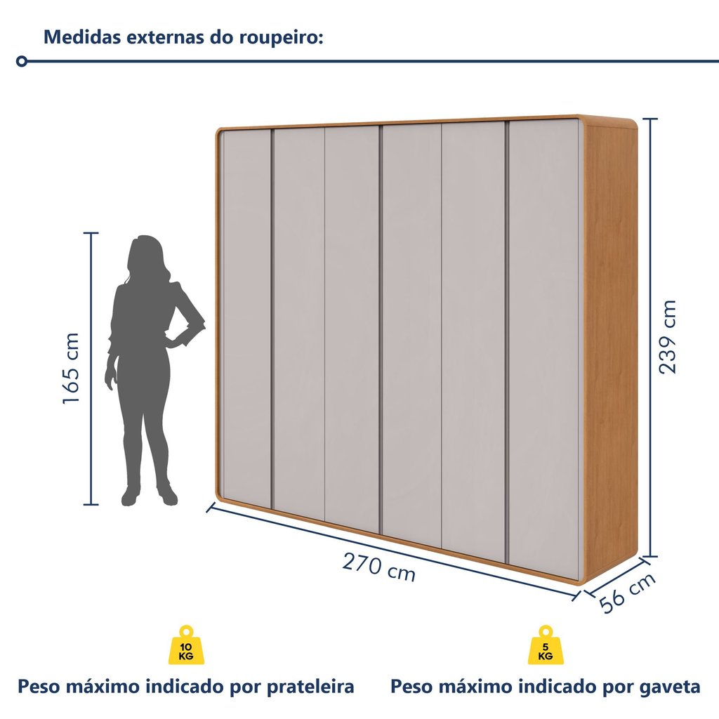 Transforme seu quarto em um ambiente sofisticado e funcional com o Guarda-Roupa Casal Loop. Desenvolvido para quem precisa de muito espaço sem abrir mão do estilo moderno, este móvel é a solução definitiva para a organização de roupas, calçados e acessórios de toda a família. Com uma estrutura robusta fabricada em 100% MDF, o modelo Loop oferece durabilidade superior e acabamento impecável em Pintura UV fosca. Suas 6 portas de bater possuem puxadores embutidos usinados na própria madeira, um detalhe de design que confere um visual limpo e contemporâneo, eliminando excessos e valorizando a estética do ambiente. O aproveitamento interno é um dos grandes diferenciais deste roupeiro. Com 270 cm de largura, ele dispõe de 6 gavetas internas equipadas com corrediças telescópicas para abertura total e suave. Além disso, conta com 2 cabideiros resistentes e 6 prateleiras bem distribuídas, suportando até 10kg cada, ideais para manter desde roupas de cama até peças mais pesadas perfeitamente organizadas. As dimensões generosas de 239 cm de altura e 56 cm de profundidade garantem que você tenha um verdadeiro closet compacto, otimizando a área útil do seu quarto. A combinação de cores e o design atemporal facilitam a harmonização com diferentes estilos de decoração, tornando o Guarda-Roupa Loop um investimento em conforto e beleza. Importante: o produto não inclui itens decorativos ou acessórios mostrados nas imagens. Confira o título e a ficha técnica completa para garantir que sua compra seja exatamente o que você espera! Garanta o encaixe perfeito! Planeje seu ambiente com cuidado comparando as medidas do produto com o espaço disponível e reserve uma folga de até 2 cm para posicioná-lo com conforto. Estilo: Moderno Modular: Não Peso (kg): 234.19 Garantia: 03 Meses Altura (cm): 239 Acabamento: Pintura UV Largura (cm): 270 Possui Pés: Não Cor da Porta: Off White Possui Portas: Sim Tipo de Porta: Bater Porta Janelada: Não Possui Gavetas: Sim Tipo de Gaveta: Interna Possui Espelhos: Não Profundidade (cm): 56 Escala de Brilho: Fosco Gaveta com Chave: Não Possui Calceiros: Não Material da Porta: MDF Origem do Produto: Nacional Possui Cabideiros: Sim Ambiente Principal: Quarto Material da Gaveta: MDF Material Principal: MDF Possui Prateleiras: Sim Acabamento da Porta: Pintura UV Nicho com Cabideiro: Não Acabamento da Gaveta: Pintura UV Tipo de Guarda-roupa: Casal Espessura do Fundo (mm): 3 Material da Prateleira: MDF Peso Máximo por Gaveta: 5 Espessura das Portas (mm): 15 Acabamento da Prateleira: Pintura UV Tipo de Puxador da Porta: Embutido Escala de Brilho da Porta: Fosco Espessura da Estrutura (mm): 15 Tipo de Puxador da Gaveta: Externo Escala de Brilho da Gaveta: Fosco Peso Máximo por Prateleira: 10 Tipo de Corrediça da Gaveta: Metálica Telescópica Espessura das Prateleiras (mm): 15 Material do Puxador da Porta: MDF Possui Organizador de Gaveta: Não Escala de Brilho da Prateleira: Fosco Espessura do Fundo das Gavetas (mm): 2.7 Tipo de Dobradiça/Corrediça da Porta: Telescópica Marca: Móveis Lopas Cor Interna: Amêndoa Clean Cor: Amêndoa Clean/Off White Cor do Produto: Amêndoa Clean/Off White Itens Inclusos: 1 Guarda Roupa, kit ferragens e manual de montagem Cor Predominante: Off White Linha ou Coleção: Loop Cor do Puxador: Off White Quantidade de Cabideiros: 02 Cabideiros Quantidade de Prateleiras: 06 Prateleiras Quantidade de Portas: 6 Portas Quantidade de Gavetas: 06 Gavetas