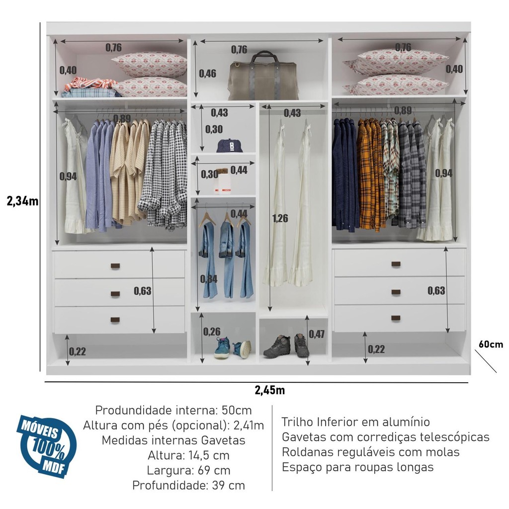 Guarda Roupa Casal Maia 3 Portas 6 Gavetas Bom Pastor O Guarda-Roupa Casal Maia 3 Portas 6 Gavetas Bom Pastor é sinônimo de praticidade, elegância e resistência. Produzido em 100% MDF, oferece alta durabilidade e acabamento de qualidade superior. Com 3 portas de correr, é perfeito para otimizar o espaço do quarto sem abrir mão da organização. Seu interior conta com profundidade útil de 50 cm, ideal para acomodar roupas, calçados e acessórios com facilidade. Além disso, possui 6 gavetas funcionais, que proporcionam ainda mais praticidade no dia a dia. Com 2,34 m de altura e 2,45 m de largura, é um móvel amplo e robusto, ideal para quem busca espaço e sofisticação. Enviado direto da fábrica em 7 volumes, exige montagem profissional para garantir segurança e acabamento impecável. Especificações Quantidade de portas: Portas Tipo de porta: Porta de Quantidade de gavetas: Gavetas Material da estrutura: 100% MDF Tipo de corrediças: Telescópica Ideal para: Solteiro ou Casal Medidas:Altura: 2,34 m (sem pés) e 2,41 m (com pés) / Largura: 2,45 m / Profundidade Externa: 60 cm / Profundidade Interna útil: 50 cm Peso aproximado: 236 kg Observações importantes: A Loja Bom Pastor não faz montagem de produtos. Todos os produtos acompanham manual de montagem. A montagem é de exclusiva responsabilidade do adquirente. É imprescindível a contratação de um montador profissional para montar o produto. Não nos responsabilizamos por danos de quaisquer naturezas causados no produto pela montagem. Produtos podem apresentar diferenças de tonalidades entre a foto na tela e o produto real, devido a calibração de cor da tela. Os objetos decorativos que ambientam as fotos não são vendidos e não acompanham o produto. Favor confira se todos os volumes que constam na nota, foram descarregados. E verifique se as embalagens estão em boas condições no momento da entrega. A Loja Bom Pastor e o serviço de transporte não se responsabilizam por produtos que precisem subir escadas, ou serem içados para algum andar superior e não realizam tais serviços e este serviço fica a cargo do cliente. Verifique as dimensões do produto antes de finalizar a compra. Certifique-se que o produto passa por escadas, vãos, portas ou janelas antes de finalizar a compra.