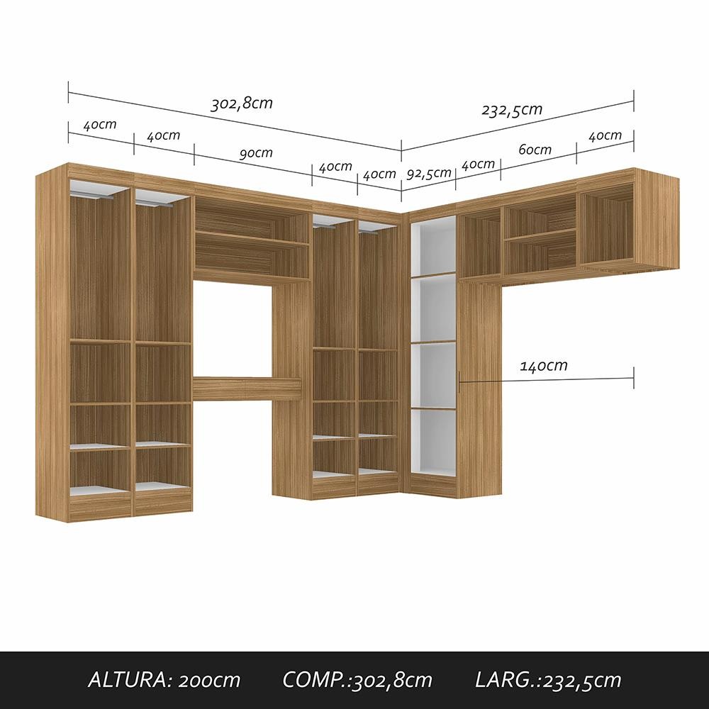 O Guarda Roupa Modulado Sarah é prático pois reúne nichos, penteadeiras o suficiente para quem quer inovar o seu ambiente! Detalhes Técnicos: Medidas do Guarda-Roupa Montado: A: 200cm | C: 302,8cm | L: 232,5cm 1 ESCRIVANINHA SUSPENSA: A:15,3cm | L:90cm | P:34cm 4 MÓDULOS DE 1PT: A:200cm | L:40cm | P:47cm 1 MODULADO CANTO RETO: A:200cm | L:91,5cm | P:51,6cm 2 MODULADO NICHO 1PT: A: 53,9cm | L:40cm | P:47cm 1 MODULADO NICHO 90cm: A:53,9cm | L:90cm | P:46,5cm 1 MODULADO NICHO 60cm: A:53,9cm | L:60cm | P:46,5cm Materiais de Fabricação: - MDP 15mm - Acabamento em FF (Finish Foil) - Cabideiros Alumínio - Puxadores em Alumínio - Tonalidade: Boreal/Branco - Estruturado com material de altíssima qualidade, evitando fungos e mofo Observações Importantes: - Imagens ambientadas meramente ilustrativas, objetos decorativos não compõe o produto; - Produto novo, garantia somente para defeitos de fabricação: 3 meses; - Não realizamos entregas em zonas rurais, via caminhos fluviais e distritos, NÃO ACEITAMOS CEP GERAL; - Não trabalhamos com entrega agendada. O recebedor deve ter mais de 18 anos. O valor do frete não inclui: subida de escada, elevador ou lançamento de produto, em condomínio residencial a entrega é feita somente até a portaria. As entregas são realizadas em dias e horários comerciais; - Ao receber o produto observe se a embalagem está em perfeita condição. Confira atentamente a quantidade de volumes; - Produto entregue desmontado. É responsabilidade do cliente a montagem/instalação do produto, inclusive despesa para sua realização. Recomendamos a contratação de um profissional especializado; - Evitar a exposição direta à luz solar e à umidade. Limpar com pano macio e seco, não utilizar produtos químicos; - A cor do produto pode variar de acordo com o monitor, a iluminação do ambiente ou sua percepção visual.