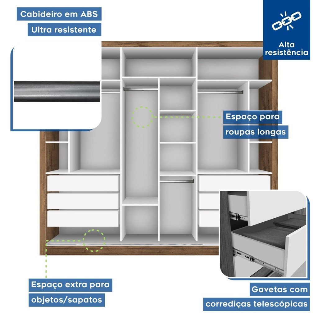 Nosso guarda roupa com espelho é a peça-chave para quem busca otimizar o espaço sem perder a elegância. Seus cabideiros e prateleiras garantem a organização, enquanto o espelho traz a sensação de amplitude. Perfeito para quem ama espaços modernos e funcionais, ele é ideal tanto para o quarto de casal quanto para quartos individuais, combinando com qualquer decoração. Posso usar o guarda roupa com portas de correr para quem divide quarto? Sim, ele é espaçoso e prático para organizar as roupas de duas pessoas! É seguro para usar como guarda roupa infantil? Claro! Ele tem acabamento seguro, ideal para qualquer idade. Estilo: Moderno Modular: Não Peso (kg): 186 Garantia: 03 Meses Altura (cm): 218 Acabamento: Pintura UV Largura (cm): 242 Possui Pés: Não Possui Portas: Sim Tipo de Porta: Correr Possui Gavetas: Sim Suporta Até (kg): 90 Tipo de Gaveta: Interna Possui Espelhos: Não Profundidade (cm): 55 Escala de Brilho: Semi-Brilho Gaveta com Chave: Não Possui Calceiros: 1 Possui Sapateira: Não Material da Porta: MDP Origem do Produto: Nacional Possui Cabideiros: Sim Ambiente Principal: Quarto Material da Gaveta: MDP Material Principal: MDP Possui Prateleiras: Sim Acabamento da Porta: Pintura Acabamento da Gaveta: Pintura Tipo de Guarda-roupa: Casal Espessura do Fundo (mm): 3 Material da Prateleira: MDP Peso Máximo por Gaveta: 10 Espessura das Portas (mm): 15 Acabamento da Prateleira: Pintura Tipo de Puxador da Porta: Embutido Escala de Brilho da Porta: Semi-Brilho Espessura da Estrutura (mm): 15 Tipo de Puxador da Gaveta: Embutido Escala de Brilho da Gaveta: Semi-Brilho Peso Máximo por Prateleira: 5 Tipo de Corrediça da Gaveta: Metálica Telescópica Espessura das Prateleiras (mm): 15 Material do Puxador da Porta: Plástico Possui Organizador de Gaveta: Não Escala de Brilho da Prateleira: Semi-Brilho Espessura do Fundo das Gavetas (mm): 3 Tipo de Dobradiça/Corrediça da Porta: Telescópica Marca: Espresso Móveis Cor: Freijó Cor do Produto: Freijó Itens Inclusos: 1 Guarda Roupa, Kit Ferragens e Manual de Montagem Cor Predominante: Marrom Linha ou Coleção: Liv Cor do Puxador: Cromado Quantidade de Cabideiros: 03 Cabideiros Quantidade de Prateleiras: 10 Prateleiras Quantidade de Portas: 3 Portas Quantidade de Gavetas: 06 Gavetas