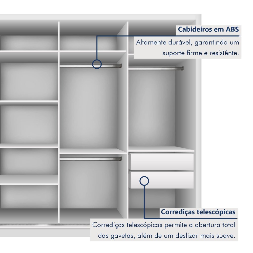Nosso guarda roupa com espelho é a peça-chave para quem busca otimizar o espaço sem perder a elegância. Seus cabideiros e prateleiras garantem a organização, enquanto o espelho traz a sensação de amplitude. Perfeito para quem ama espaços modernos e funcionais, ele é ideal tanto para o quarto de casal quanto para quartos individuais, combinando com qualquer decoração. Posso usar o guarda roupa com portas de correr para quem divide quarto? Sim, ele é espaçoso e prático para organizar as roupas de duas pessoas! É seguro para usar como guarda roupa infantil? Claro! Ele tem acabamento seguro, ideal para qualquer idade. Estilo: Moderno Modular: Não Peso (kg): 182 Garantia: 03 Meses Altura (cm): 218 Acabamento: Pintura UV Largura (cm): 279.3 Possui Pés: Não Possui Portas: Sim Tipo de Porta: Correr Possui Gavetas: Sim Tipo de Gaveta: Interna Possui Espelhos: Não Profundidade (cm): 55 Escala de Brilho: Semi-Brilho Gaveta com Chave: Não Possui Calceiros: 1 Possui Sapateira: Não Material da Porta: MDP Origem do Produto: Nacional Possui Cabideiros: Sim Ambiente Principal: Quarto Material da Gaveta: MDP Material Principal: MDP Possui Prateleiras: Sim Acabamento da Porta: Pintura Acabamento da Gaveta: Pintura Tipo de Guarda-roupa: Casal Espessura do Fundo (mm): 3 Material da Prateleira: MDP Peso Máximo por Gaveta: 10 Possui Espelho Interno: Não Espessura das Portas (mm): 15 Acabamento da Prateleira: Pintura Tipo de Puxador da Porta: Embutido Escala de Brilho da Porta: Semi-Brilho Espessura da Estrutura (mm): 15 Tipo de Puxador da Gaveta: Embutido Escala de Brilho da Gaveta: Semi-Brilho Peso Máximo por Prateleira: 5 Tipo de Corrediça da Gaveta: Metálica Telescópica Espessura das Prateleiras (mm): 15 Material do Puxador da Porta: Plástico Possui Organizador de Gaveta: Não Escala de Brilho da Prateleira: Semi-Brilho Espessura do Fundo das Gavetas (mm): 3 Tipo de Dobradiça/Corrediça da Porta: Telescópica Marca: Espresso Móveis Cor: Branco Cor do Produto: Branco Itens Inclusos: 1 Guarda Roupa, Kit Ferragens e Manual de Montagem Cor Predominante: Branco Linha ou Coleção: Liv Cor do Puxador: Cromado Quantidade de Cabideiros: 03 Cabideiros Quantidade de Prateleiras: 11 Prateleiras Quantidade de Portas: 4 Portas Quantidade de Gavetas: 04 Gavetas