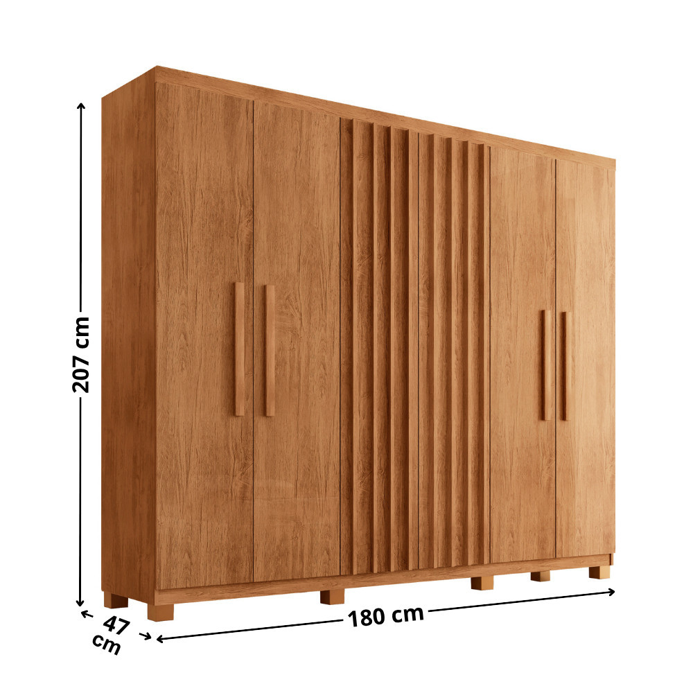 Guarda Roupa Casal Roma MDF 6 Portas e 2 Gavetas Com Pés Se você busca estilo, funcionalidade e organização em um só lugar, o Guarda-Roupa Roma 6 Portas é a resposta para os seus desejos! Moderno e seguindo as últimas tendências de design ripado, este guarda-roupa é a combinação perfeita de elegância e praticidade. Ele é projetado com uma boa capacidade de armazenamento e uma distribuição interna pensada para a máxima organização com prateleiras, cabideiros e gavetas. Transforme seu espaço, encontre tranquilidade e estilo no seu dia a dia! Características: Material da Estrutura: 100 MDF Tipo de Acabamento: Pintura UV Material das Corrediças: Telescópica Material dos Cabideiros: Alumínio Com Pés Dimensões do Roupeiro: Altura: 207 cm Largura: 180 cm Profundidade: 47 cm Garantia do Fornecedor: 3 meses Informações Importantes: As tonalidades das cores podem sofrer alteração de acordo com a configuração de cada monitor. Os objetos que ambientam as fotos não acompanham o produto. Não disponibilizamos a montagem do produto. Não nos responsabilizamos por danos no produto causado por montagem. Verifique as dimensões do produto e certifique-se que o percurso que ele fará até o local de uso permite sua passagem. Favor verificar o produto no ato da entrega e em caso de problemas decorrentes no transporte (arranhados, quebra, batida, amassados) deve-se efetuar a ressalva na nota fiscal para conhecimento da transportadora e comunicar imediatamente a loja. Moderna Mobília reserva o direito de alterar as especificações técnicas sem prévio aviso. As medidas contidas no site podem sofrer variações de acordo com a montagem, tipo de costura etc. A montagem será de responsabilidade do comprador. Não nos responsabilizamos, no ato da entrega, por subir escadas/elevadores em apartamentos. Eventuais despesas são de responsabilidade do comprador.