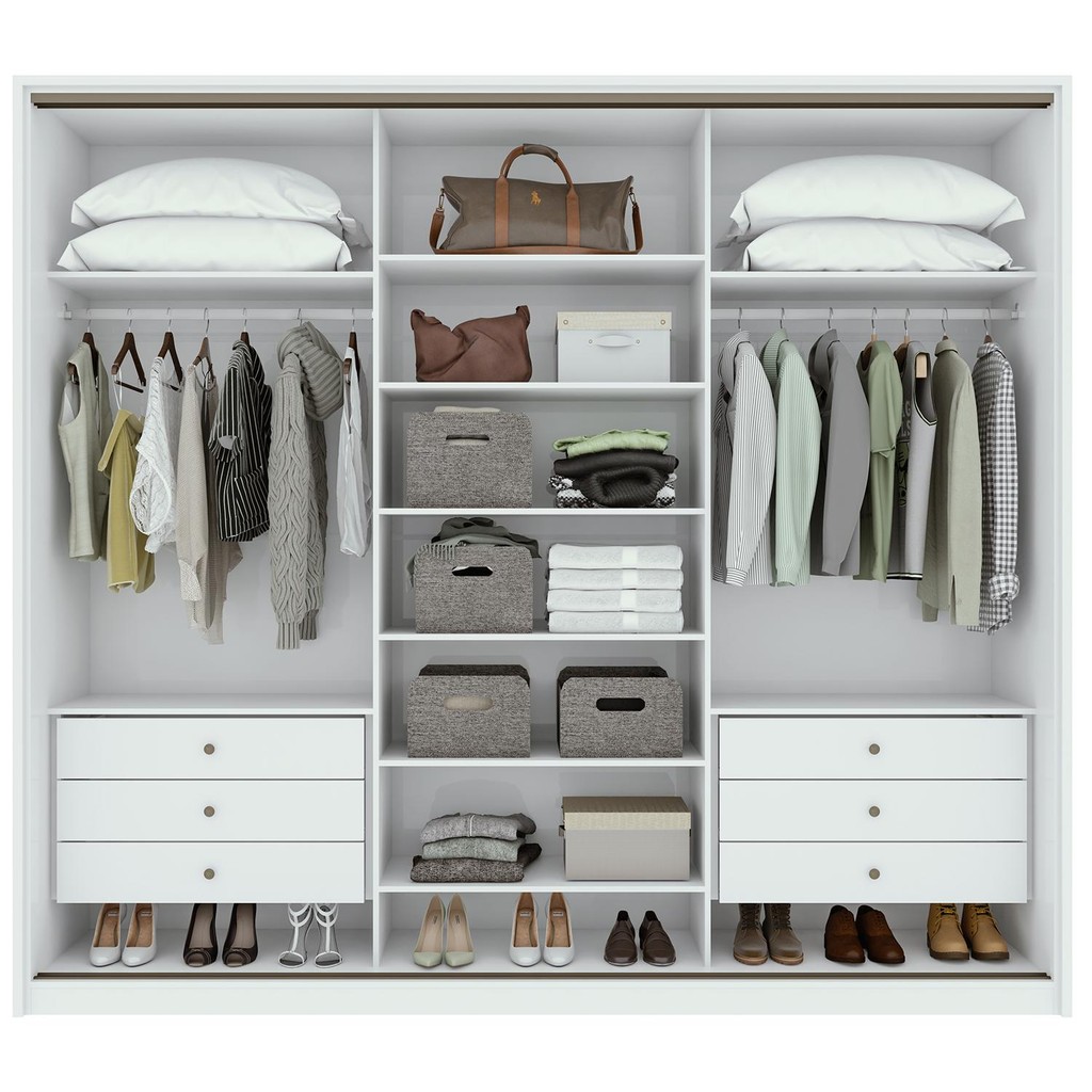 Luxo, Glamour e comodidade! Assim se definde a composição do que é o magnífico Guarda Roupa Spazio 2,70m! Um grandioso móvel projetado especacialmente para acomodar com toda praticidade possível suas roupas e utensílios. O Spazio é um produto feito em MDF, com chapas de 15mm, o que gera a devida imponência que essa moilia transmite. Mais do que presença, seu interior é dividido em 13 nichos distribuidos de forma otimizada, onde suas 6 gavetas com corrediças telescópicas garantes ainda mais a arrumação. Um dos fatores especiais é a gaveta com colmeia organizadora, um item super funcional para organizar pequenos utensílios. Já os trilhos em alumínio das portas garantem o conforto e segurança. Garanta já essa mobilia especial e desfrute do luxo e conforto do Guarda Roupa Spazio 2,70! Características: Produto em MDF com chapas de 15mm; Pintura U.V. e acabamento em micro textura; Encabeçamento das portas em alumínio; Bordas emolduradas com chapas de 25mm; 03 portas deslizantes; Interno diferenciado com 10 prateleiras; Maleiro individual; Gavetas com corrediças telescópicas; Gavetas com distanciadores em MDF; Gaveta com colmeia organizadora; Roldanas reguláveis com molas; Trilhos em alumínio. Vantagens/Benefícios: Produzido com equipamentos de alta tecnologia; Produto avaliado e aprovado por um rigoroso controle de qualidade; Fácil montagem e manual de montagem simplificado; Kits e acessórios vendidos separadamente, dando maior flexibilidade para o produto; Acabamento com toque aveludado; Divisão ideal para casais; Gavetas grandes e espaçosas com corrediças telescópicas; Distanciador de gavetas em MDF, dando a elas maior durabilidade; Portas dupla face que possibilitam a escolha da cor antes da montagem do produto; Portas de espelho inteiriço e moldura de alumínio que dão a sensação de amplitude; Espelho com película protetora que impede acidentes em caso de quebra; Interno do produto da mesma cor do externo.