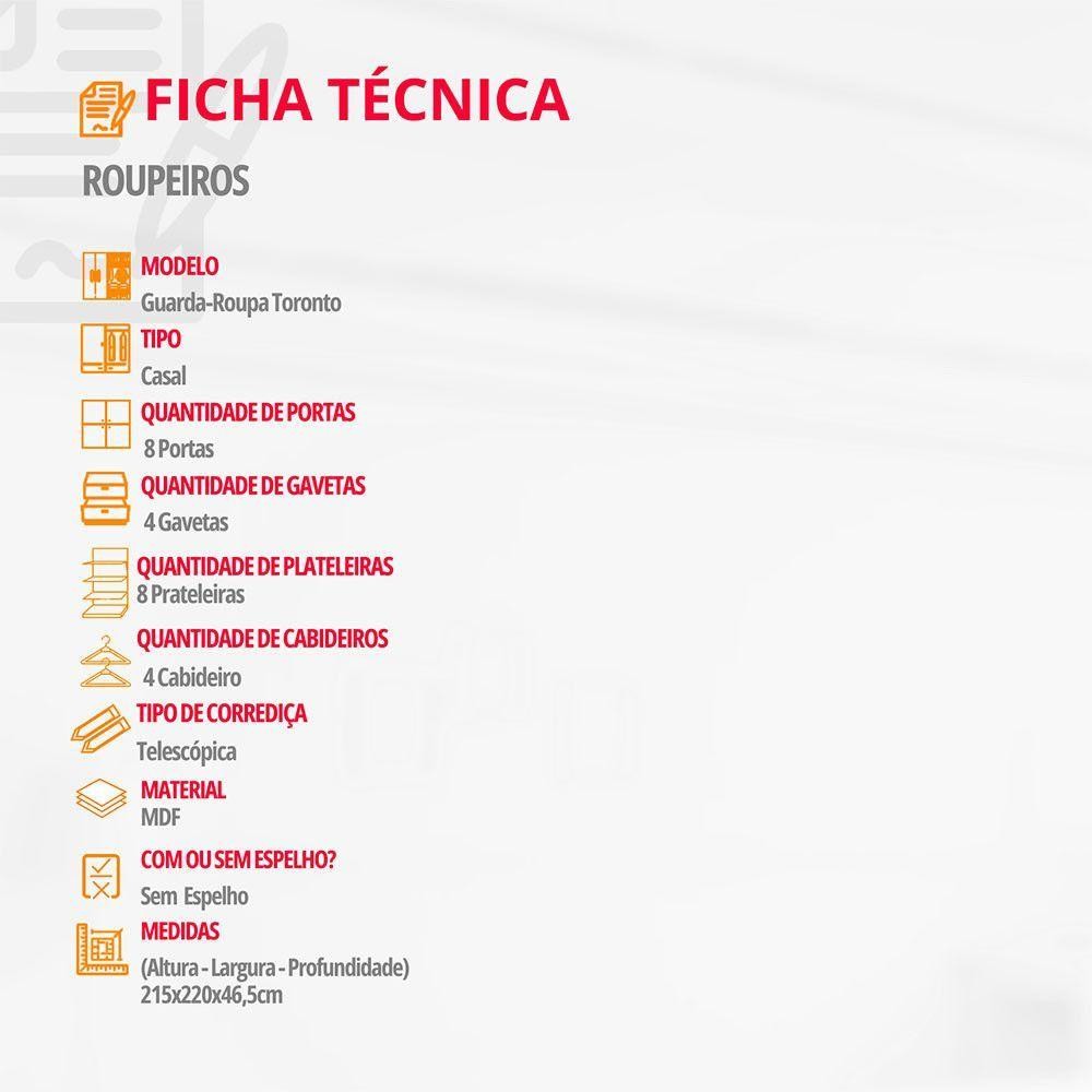 Guarda Roupa Casal Toronto Mdf 8 Portas Moderna Mobília /off White/ Guarda Roupa Casal Toronto MDF 8 Portas e 4 Gavetas Moderna Mobilia Se voce busca estilo, funcionalidade e organizacao em um so lugar, o Guarda-Roupa Toronto com 8 Portas e a solucao ideal. Com um design moderno e alinhado as ultimas tendencias com design frizados, este guarda-roupa combina elegancia e praticidade de maneira impecavel. Oferecendo uma ampla capacidade de armazenamento, ele e equipado com 8 prateleiras, 4 cabideiros e 4 gavetas, proporcionando uma distribuicao interna otimizada para maxima organizacao. Transforme seu espaco, encontre tranquilidade e estilo no seu dia a dia e torne o processo de se arrumar mais pratico e satisfatorio com o Guarda-Roupa Toronto! Caracteristicas do Produto: Marca: Moderna Mobilia Material da Estrutura: 100 MDF Tipo de Acabamento: Pintura UV Material das Corredicas: Telescopica Material dos Cabideiros: Aluminio Dimensoes do Roupeiro: Altura: 215 cm Largura: 220 cm Profundidade: 46,5 cm Peso: 137,17 kg Garantia do Fornecedor: 3 meses Informacoes Importantes: As tonalidades das cores podem sofrer alteracao de acordo com a configuracao de cada monitor. Os objetos que ambientam as fotos nao acompanham o produto. Nao disponibilizamos a montagem do produto. Nao nos responsabilizamos por danos no produto causado por montagem. Verifique as dimensoes do produto e certifique-se que o percurso que ele fara ate o de uso permite sua passagem. Para mais informacoes confira as politicas de do site. Favor verificar o produto no ato da e em caso de problemas decorrentes no (arranhados, quebra, batida, amassados) deve-se efetuar a ressalva na para conhecimento da transportadora e comunicar imediatamente a . Moderna Mobilia reserva o direito de alterar as especificacoes tecnicas sem previo aviso. As medidas contidas no site podem sofrer variacoes de acordo com a montagem, tipo de costura etc.