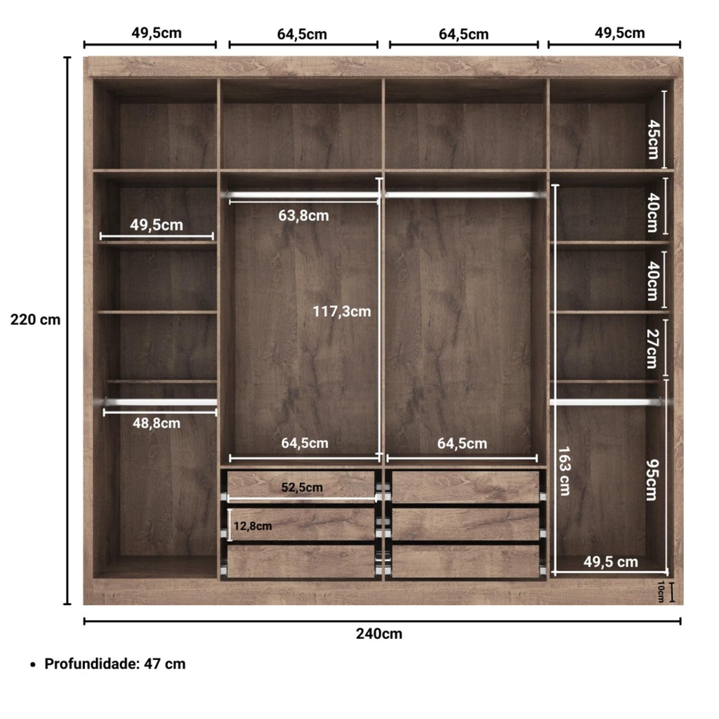 Guarda Roupa Valência com pés - O favorito absoluto para quartos de solteiro e casal. o Guarda Roupa Valência combina durabilidade com um visual moderno e sofisticado, foi projetado para atender às necessidades de duas pessoas. Seu design compacto e o inovador garantem que ambos os lados sejam idênticos, facilitando a divisão de espaço e tornando a convivência muito mais harmoniosa. Transforme seu quarto em um espaço organizado, funcional e com muito estilo. Somente com o Valência você tem: • 6 Portas de dobradiça metálicas com fechamento suave e alta durabilidade; • 6 gavetas com Corrediças Metálicas; • Puxadores em MDF; • Fabricado em MDP; • Acabamento Touch Alto-Relevo ou Alto Brilho UV; • 6 prateleiras; • 4 cabideiros; • Acompanha 1 kit espelho (8 Lâminas) no tamanho de 50x32cm; Acompanha manual de montagem; Medidas: Altura 220cm x Largura 240cm x Profundidade 47cm x Peso 156kg Medida das gavetas: Frente 56,4cm de largura x 12,8cm de altura x Lateral 38cm de profundidade \\Não nos responsabilizamos pela montagem ou instalação do produto. Sugerimos a contratação de um serviço terceirizado de montagem ou de algum profissional experiente de sua preferencia.\\ (imagens meramente ilustrativas)
