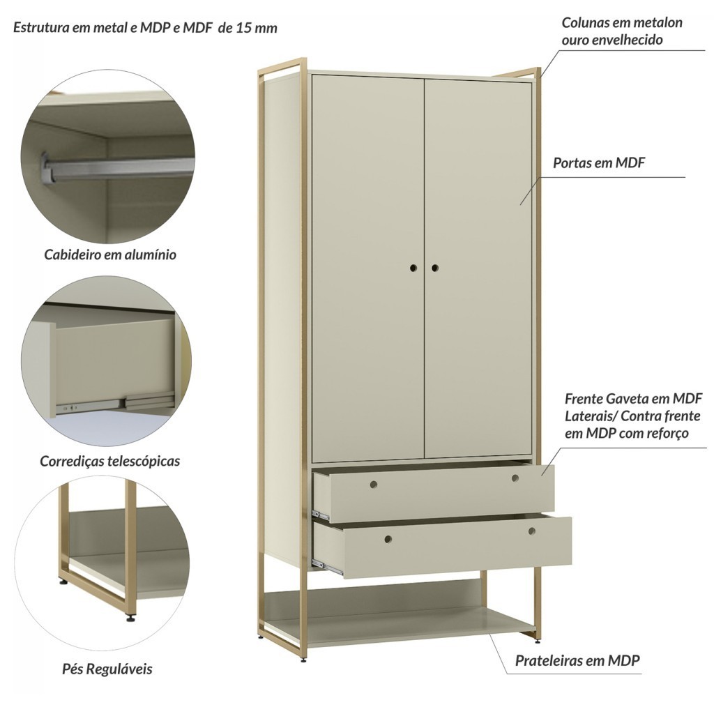 Guarda Roupa Closet Estilo Industrial Moderno Quarto cabideiro 2 P 2 Gav Off White - Olivar Móveis