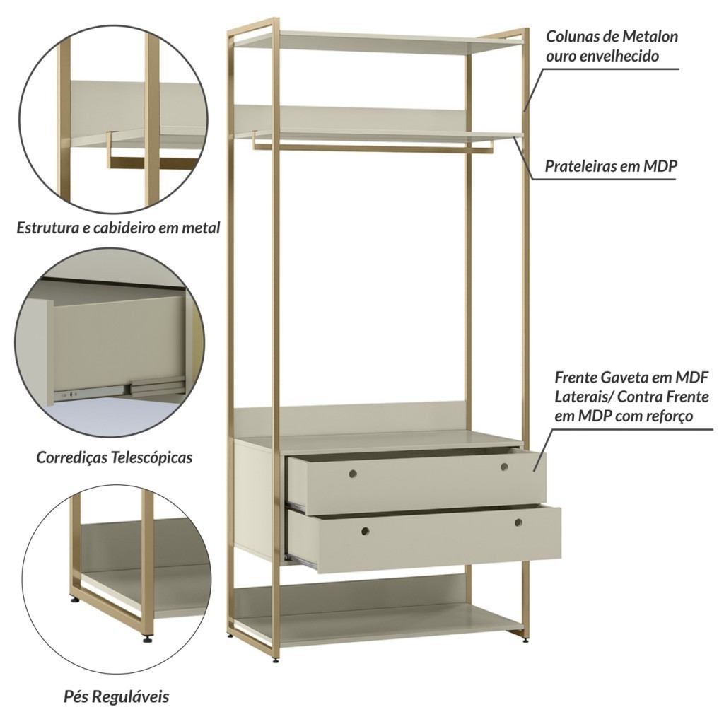 Guarda-Roupa Closet Industrial Olivar com Cabideiro 2 Gavetas 89cm - Off White