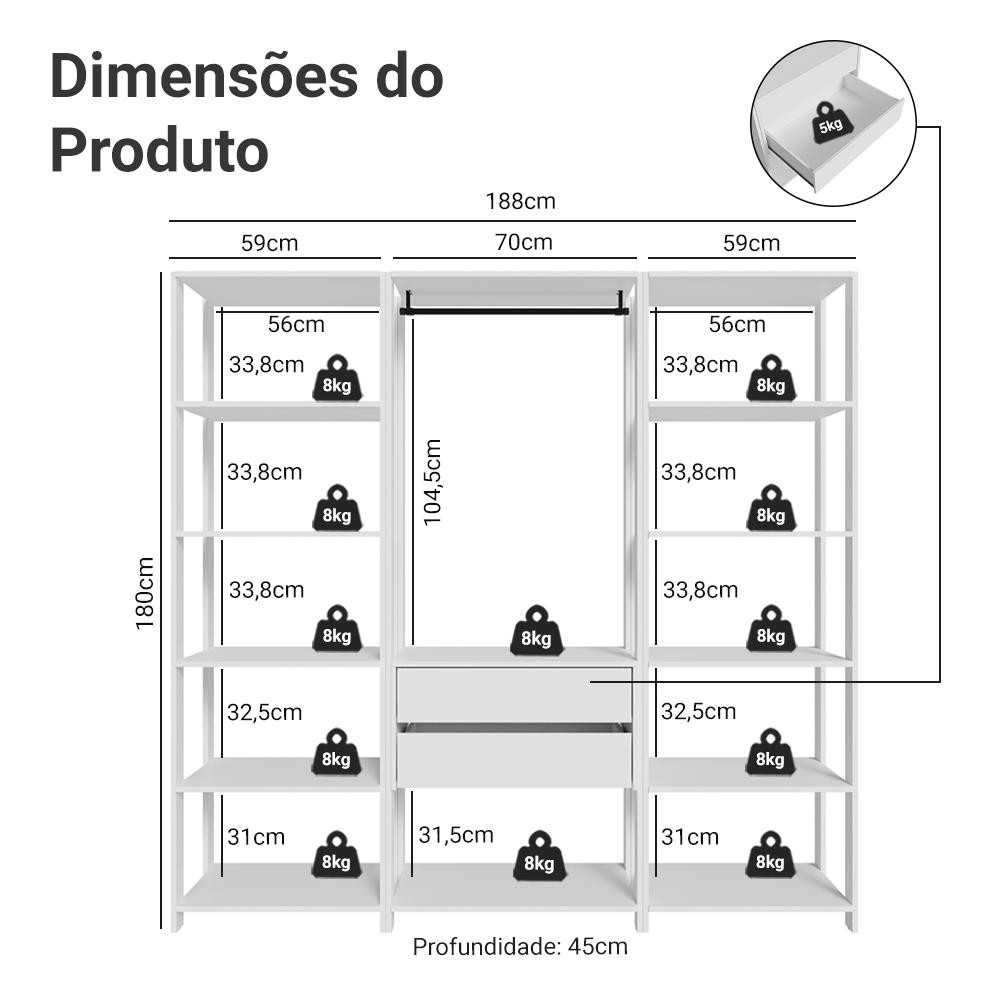 Guarda-Roupa Closet Modulado 2 Gavetas 188 cm Branco Valencia Madesa