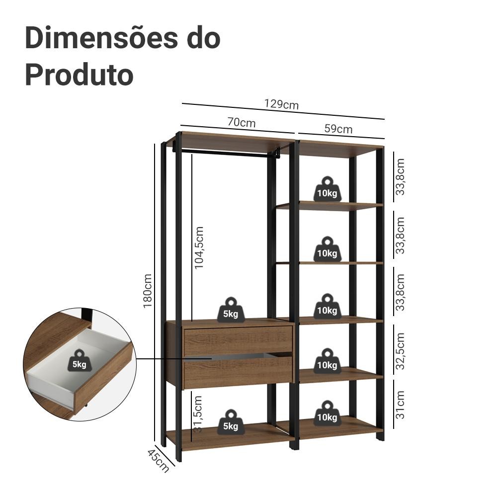 O Closet Guarda-Roupa Modulado Madesa foi projetado para otimizar o espaço e facilitar a organização de roupas e calçados. Este móvel versátil traz praticidade e um toque de modernidade ao seu quarto. Com uma estrutura aberta, oferece fácil acesso aos itens do dia a dia. Esta versão inclui duas peças separadas: uma com cabideiro metálico, prateleira e duas gavetas grandes, e a outra com cinco prateleiras amplas. Além disso, o acabamento combina os tons preto e amadeirado Rustic, proporcionando um visual sofisticado. Medidas totais: - 180 cm de altura - 129 cm de largura - 45 cm de profundidade Itens inclusos: - Um (1) Móvel de 70 cm de largura com duas (2) gavetas - Um (1) Móvel de 59 cm de largura com cinco (5) prateleiras Código do produto: XAMDDR0200407K Obs.: - As imagens são meramente ilustrativas - A Madesa não oferece serviço de montagem - Por segurança, é obrigatório fixar o móvel na parede - Acompanha ferragens e manual com todos os passos para a montagem do produto - Estruturas laterais em MDP com pintura em preto texturizado A Madesa possui compromisso com a sustentabilidade. Geramos energia limpa em nossa própria usina, priorizamos fornecedores responsáveis e utilizamos plástico reciclado em nossa produção. Além disso, reinserimos sobras no ciclo de reciclagem e investimos no desenvolvimento de nossos colaboradores e da comunidade. Garantia: Este produto conta com 1 ano de garantia total, sendo 3 meses de garantia legal e 9 meses de garantia contratual. A garantia cobre exclusivamente defeitos de fabricação e vícios ocultos. Não estão cobertos: problemas decorrentes de montagem incorreta, uso inadequado, exposição à umidade, calor ou luz solar direta, modificações no produto ou desgaste natural.
