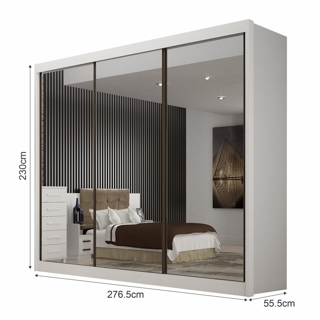 Roupeiro 03 portas São Paulo Gold Três portas espelhadas, 06 gavetas internas (gaveta com puxador) Móvel moderno para complementar e deixar seu quarto ainda mais lindo e aconchegante. Dimensões do produto: Altura 2300 mm Largura: 2765 mm Profundidade: 555mm Roupeiro 100% MDF, puxador alumínio bronze e corrediças internas. Estilo: Moderno Modular: Não Peso (kg): 212.79 Garantia: 03 Meses Altura (cm): 230 Largura (cm): 276.5 Possui Pés: Não Possui Portas: Sim Tipo de Porta: Correr Possui Gavetas: Sim Tipo de Gaveta: Interna Possui Espelhos: Sim Profundidade (cm): 55.5 Escala de Brilho: Brilhante Possui Calceiros: 1 Altura do Espelho: 208.5 Material da Porta: MDF Origem do Produto: Nacional Possui Cabideiros: Sim Ambiente Principal: Quarto Formato do Espelho: Retangular Largura do Espelho: 85.9 Material da Gaveta: MDF Material Principal: MDF Possui Prateleiras: Sim Acabamento da Porta: Pintura UV Acabamento da Gaveta: Pintura UV Espessura do Espelho: 0.3 Tipo de Guarda-roupa: Casal Espessura do Fundo (mm): 3 Material da Prateleira: MDF Peso Máximo por Gaveta: 5 Quantidade de Espelhos: 03 Espelhos com Tamanhos Iguais Espessura das Portas (mm): 15 Acabamento da Prateleira: Pintura UV Tipo de Puxador da Porta: Externo Escala de Brilho da Porta: Brilhante Espessura da Estrutura (mm): 15 Tipo de Puxador da Gaveta: Externo Tipo de Corrediça da Gaveta: Metálica Telescópica Espessura das Prateleiras (mm): 15 Material do Puxador da Porta: Alumínio Possui Organizador de Gaveta: Não Escala de Brilho da Prateleira: Brilhante Espessura do Fundo das Gavetas (mm): 3 Tipo de Dobradiça/Corrediça da Porta: Telescópica Marca: Leifer Cor Interna: Branco Cor: Branco Cor do Produto: Branco Itens Inclusos: 1 Guarda Roupa, Manual de Montagem e Kit Ferragens Cor Predominante: Branco Quantidade de Cabideiros: 03 Cabideiros Quantidade de Portas: 3 Portas