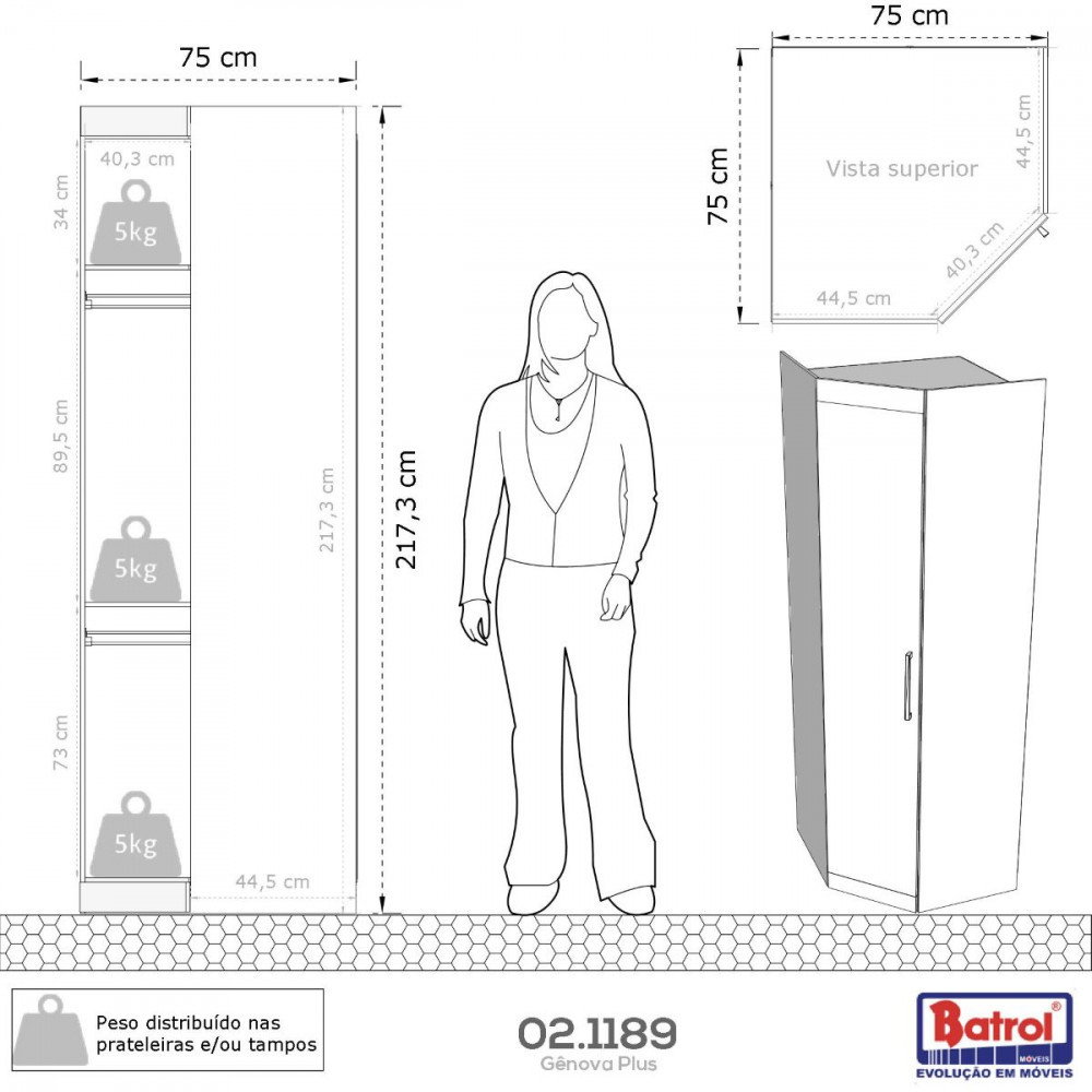 O Guarda-Roupa Genova traz a combinação perfeita entre design moderno e materiais de qualidade. Dimensões: Altura: 217 cm | Largura: 75 cm | Profundidade: 75 cm Características: - Estrutura em MDP de 12 e 15 mm - Puxador Ice Polímero - Dois cabideiros oblongos de alumínio - Dobradiça Metálica de Pressão - Pintura UV Fosco - Suporte de peso prateleira e cabideiro: 5 kg - Sem pés - Garantia 12 meses ** Imagens ilustrativas. ** O produto é enviado desmontado. AVISO: Esclarecemos que a Opção Móveis se responsabilizará pela entrega dos produtos adquiridos até a porta de entrada ou portaria do endereço indicado, ou seja: é de total responsabilidade do cliente a montagem, desmontagem e instalação do produto adquirido. Para evitar futuros desagrados ou imprevistos com a entrega, também é necessário que o cliente confira as dimensões do produto escolhido, antes de finalizar a compra, devendo certificar-se de que a mercadoria passará normalmente por elevador, porta, escada e corredor.