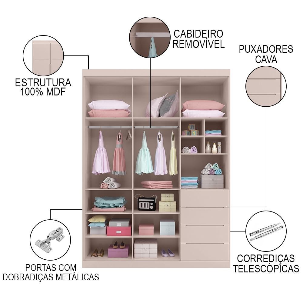 Guarda Roupa Infantil 3 Portas e 4 Gavetas Pérola Rose - Phoenix