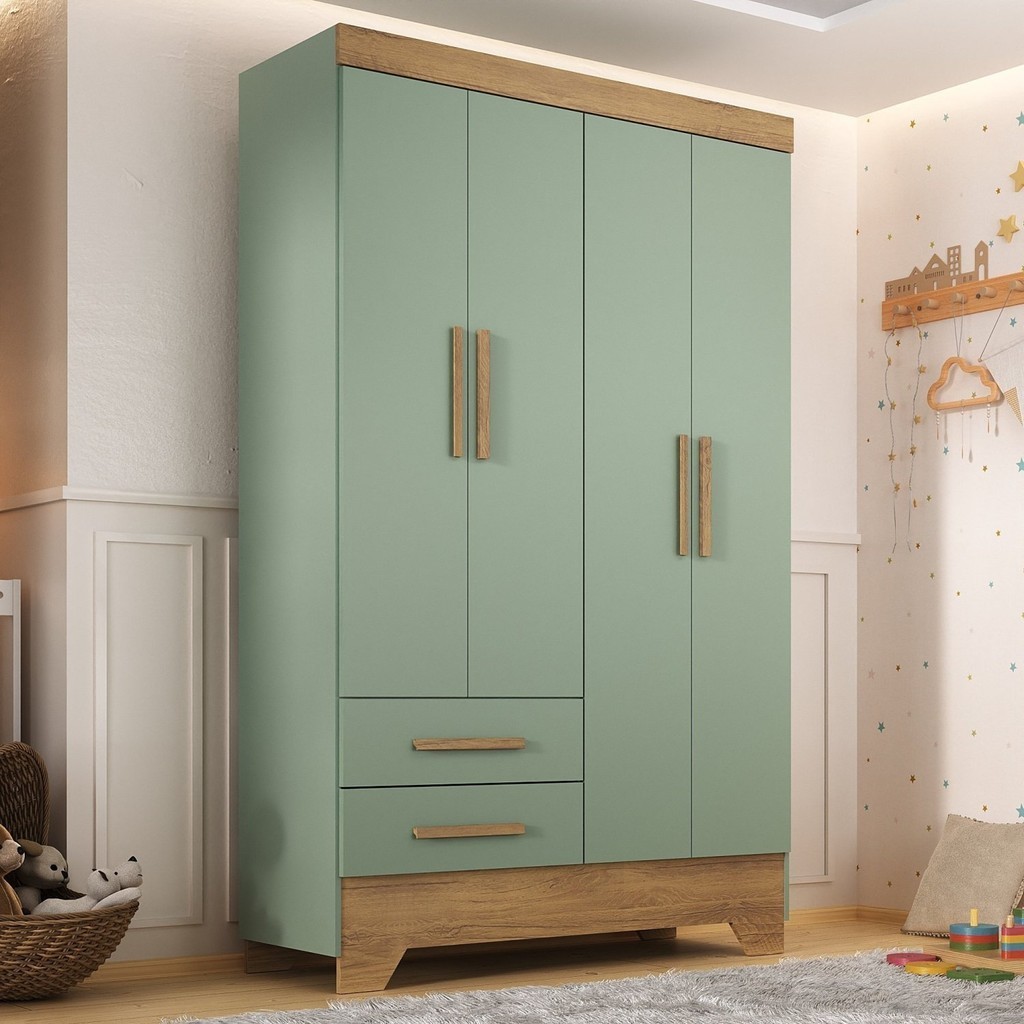 Guarda Roupa Infantil 4 Portas 2 Gavetas Verde/Natural Tic Tac Espresso Móveis Verde/Natural