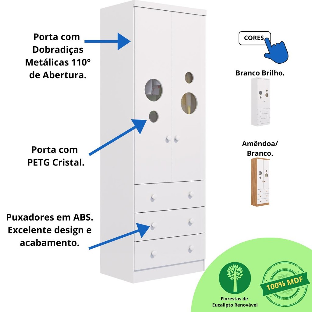 O Guarda Roupa Bolinha com 2 portas e 3 gavetas da Faura é ideal para quem busca funcionalidade em um ambiente compacto, aliado a custo-benefício, qualidade e segurança. Esse guarda roupa atende a diversos ambientes da sua casa, sendo perfeito para bebês, crianças e até para uso adulto, acompanhando o crescimento e podendo ser usado em qualquer faixa etária. O Guarda Roupa Bolinha com 2 portas e 3 gavetas é um produto 100% MDF, sua pintura é atóxica, possui cabideiro metálico e puxadores em ABS, e não possui pés. FICHA TÉCNICA Guarda Roupa Infantil Bolinha -Altura: 183 cm -Largura: 61,7 cm -Profundidade: 41,5 cm -Quantidade de Gavetas: 3 (peso suportado 4 kg) -Quantidade de Portas: 2 com PETG cristal -Material: 100% MDF -Acabamento do Produto: Pintura UV atóxica / Pintura PU e fita de bordo -Tipo de Corrediça: Telescópica -Tipo de Cabideiro: Metálico -Tipo de Puxadores: ABS revestidos -Tipo de Pés: Sem pés -Manual de Montagem: Manual segue na embalagem do produto Os entregadores não estão autorizados a subir escadas ou elevadores, realizando a entrega apenas na recepção ou portaria, conforme as normas trabalhistas dos transportadores. Recomendamos que os clientes considerem essa limitação ao realizar suas compras. Imagens meramente ilustrativas: a decoração não acompanham o produto. -Recomendações de Uso, Manutenção e Limpeza: Para limpeza utilize somente pano limpo e macio, ligeiramente umedecido em água, seguido de um pano seco. Perguntas Frequentes A - É fácil montar o Guarda-Roupa Infantil Bolinha? Sim, é fácil. Ao abrir a embalagem, pode parecer complicado, mas é só seguir o passo a passo no manual de montagem que você consegue! Caso você entenda que não terá condições de realizar a montagem, recomendamos contratar um montador profissional na sua cidade. Nós não realizamos a montagem dos produtos e não oferecemos esse serviço. B - Qual a configuração do Guarda-Roupa Infantil Bolinha? É um Guarda-Roupa Infantil com 2 portas e 3 gavetas. C - Como organizar o Guarda-Roupa Infantil Bolinha? Você encontrará a melhor maneira de organizar seu Guarda Roupa Infantil. Algumas dicas incluem: 1. O Guarda-Roupa Infantil deve estar sempre limpo. 2. Primeira Gaveta: Utilize para produtos de higiene do bebê. 3. Demais gavetas: Use para roupas e acessórios do bebê. D - Quais as cores disponíveis para o Guarda-Roupa Infantil Bolinha? Disponíveis nas cores: Branco Brilho, Amêndoa/Branco.