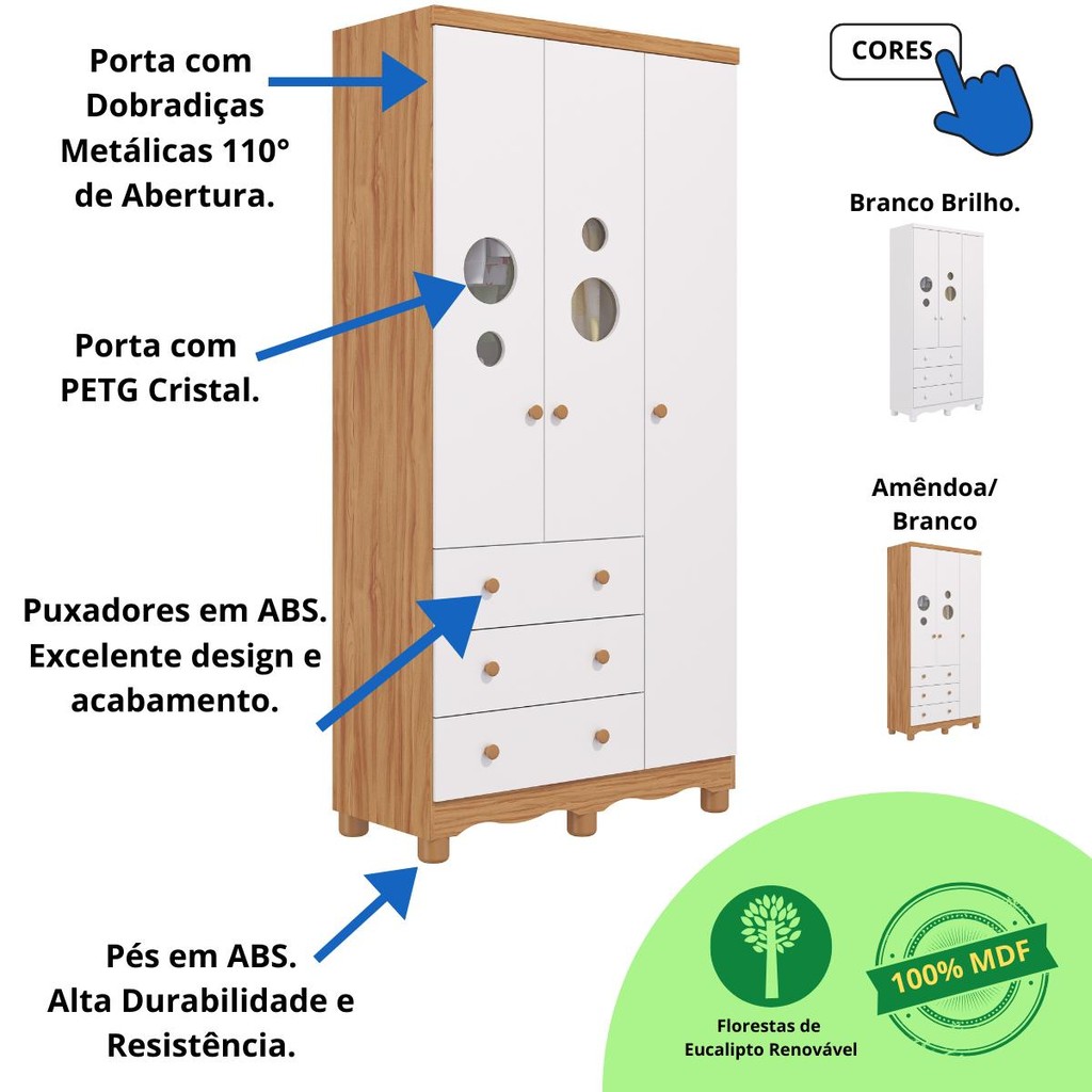 O Guarda Roupa Bolinha de 3 Portas da Faura é lindo e super prático. Ideal para organizar as roupas e demais acessórios do seu filho(a), na organização das roupas e demais acessórios de uso diário, com alta durabilidade e resistência, possui design moderno, ideal para o quartinho do seu pequeno(a). O Guarda Roupa Bolinha 03 portas é um produto 100% MDF, sua pintura é atóxica, possui cabideiro metálico, puxadores ABS, corrediças telescópica, pé ABS, 02 modelos de rodapé incluso e portas com PETG cristal. Informações do produto: -Guarda Roupa Bolinha Infantil Modelo: Bolinha Altura: 188 cm Largura: 92 cm Profundidade: 41 cm Quantidade de Gavetas: 03 Gavetas ( Peso suportado 4Kg) Quantidade de Portas: 03 Portas Material: 100% MDF Cores Disponíveis: Branco Brilho, Amêndoa/Branco Acabamento do Produto: Pintura UV Atóxica/ Pintura PU e Fita de Bordo Acabamento das Portas: PETG Cristal ( Acrílico transparente ) Tipo de Corrediça: Telescópica Tipo de Cabideiro: Metálico Tipo de Puxadores: ABS Tipo de Pés: ABS ( Altura 6cm) -Manual de Montagem: Manual segue na embalagem do produto - Os entregadores não estão autorizados a subir escadas ou elevadores, realizando a entrega apenas na recepção ou portaria, conforme as normas trabalhistas dos transportadores. Recomendamos que os clientes considerem essa limitação ao realizar suas compras - Imagens meramente ilustrativas: a decoração não acompanham o produto. -Recomendações de Uso, Manutenção e Limpeza: Para limpeza utilize somente pano limpo e macio, ligeiramente umedecido em água, seguido de um pano seco. Perguntas Frequentes: A - É fácil montar o Guarda Roupa Bolinha Infantil? Nível de complexidade alta, sugerimos a contratação de um montador especializado. Nós não realizamos a montagem dos produtos e não oferecemos esse serviço. B - Tenho a opção de comprar o Guarda Roupa Bolinha Infantil ou Cômoda Bolinha Infantil separados? Sim, só buscar aqui no site que vai encontrar nossa oferta. C - Qual a configuração do Guarda Roupa Infantil Bolinha da Faura? Guarda Roupa Infantil Bolinha com 3 gavetas e 3 portas. D - Quais as cores disponíveis para o Guarda Roupa Bolinha Infantil? Temos nas cores: Branco Brilho, Amêndoa/Branco .