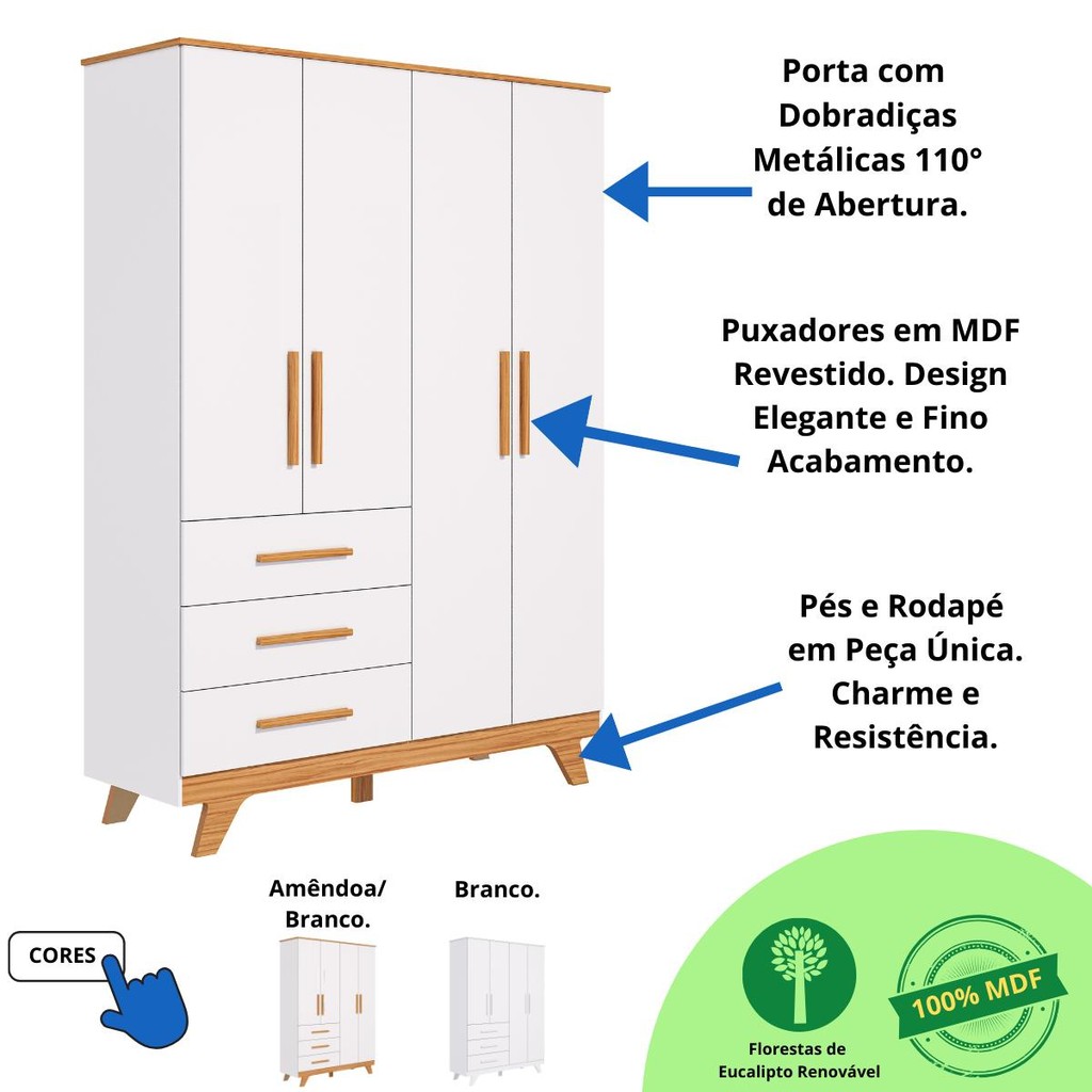 O Guarda Roupa Infantil Retro é a solução perfeita para manter o quarto da sua criança bem organizado. Com 4 Portas e 3 Gavetas e compartimentos que podem ser utilizados para guardar os seus pertences de forma fácil e otimizada. Além disso, ele tem um belo visual tradicional que complementará a decoração do seu espaço no estilo Retrô. O Guarda Roupa Retrô 04 portas lisa é um produto 100% MDF, sua pintura é atóxica, possui cabideiros metálicos, puxadores em MDF revestido, e corrediças telescópicas. FICHA TÉCNICA -Guarda Roupa Infantil Retrô Altura: 209,6 cm Largura: 154,8 cm Profundidade: 49,8 cm Quantidade de Gavetas: 03 Gavetas (Peso suportado 4Kg) Quantidade de Portas: 04 Portas Material: 100% MDF Cores Disponíveis: Branco Brilho e Amêndoa/Branco Acabamento do Produto: Pintura UV Atóxica/ Pintura PU e Fita de Bordo Acabamento das Portas: Lisa Pintura UV Atóxica Tipo de Corrediça: Corrediça Telescópica Tipo de Cabideiro: Cabideiro Metálico Tipo de Puxadores: MDF revestido Tipo de Pés: MDF Rodapé: Desenho Retrô -Manual de Montagem: Manual segue na embalagem do produto - Os entregadores não estão autorizados a subir escadas ou elevadores, realizando a entrega apenas na recepção ou portaria, conforme as normas trabalhistas dos transportadores. Recomendamos que os clientes considerem essa limitação ao realizar suas compras. - Imagens meramente ilustrativas: a decoração não acompanham o produto. -Recomendações de Uso, Manutenção e Limpeza: Para limpeza utilize somente pano limpo e macio, ligeiramente umedecido em água, seguido de um pano seco. Perguntas Frequentes: A - É fácil montar o Guarda Roupa Infantil Retrô da Faura? Sim, é fácil. Ao abrir a embalagem pode parecer complicado, mas é só seguir o passo a passo no manual de montagem que você consegue! Caso você entenda que não terá condições de realizar a montagem, recomendamos contratar um montador profissional na sua cidade. Nós não realizamos a montagem dos produtos e não oferecemos esse serviço. B - Tenho a opção de comprar Berço ou Cômoda Infantil Retrô separado? Sim, só buscar aqui no site que vai encontrar nossa oferta. C - Qual a configuração do Guarda Roupa Infantil Retrô da Faura? Guarda Roupa infantil Retrô com 3 gavetas e 4 portas. D - Como organizar a Guarda Roupa Infantil Retrô? Você vai naturalmente encontrar a melhor maneira de organizar seu Guarda Roupa. Entretanto, vale a pena pontuar algumas situações: 1-A Guarda Roupa deve estar sempre limpo*; 2-Primeira Gaveta: Utilize para os produtos de Higiene do bebê; 3-Demais Gavetas: Utilize para roupas e acessórios do bebê. 4-Nos cabides as roupas maiores e roupas com usos menos frequentes e nos nichos e prateleiras artigos e objetos de uso diários.
