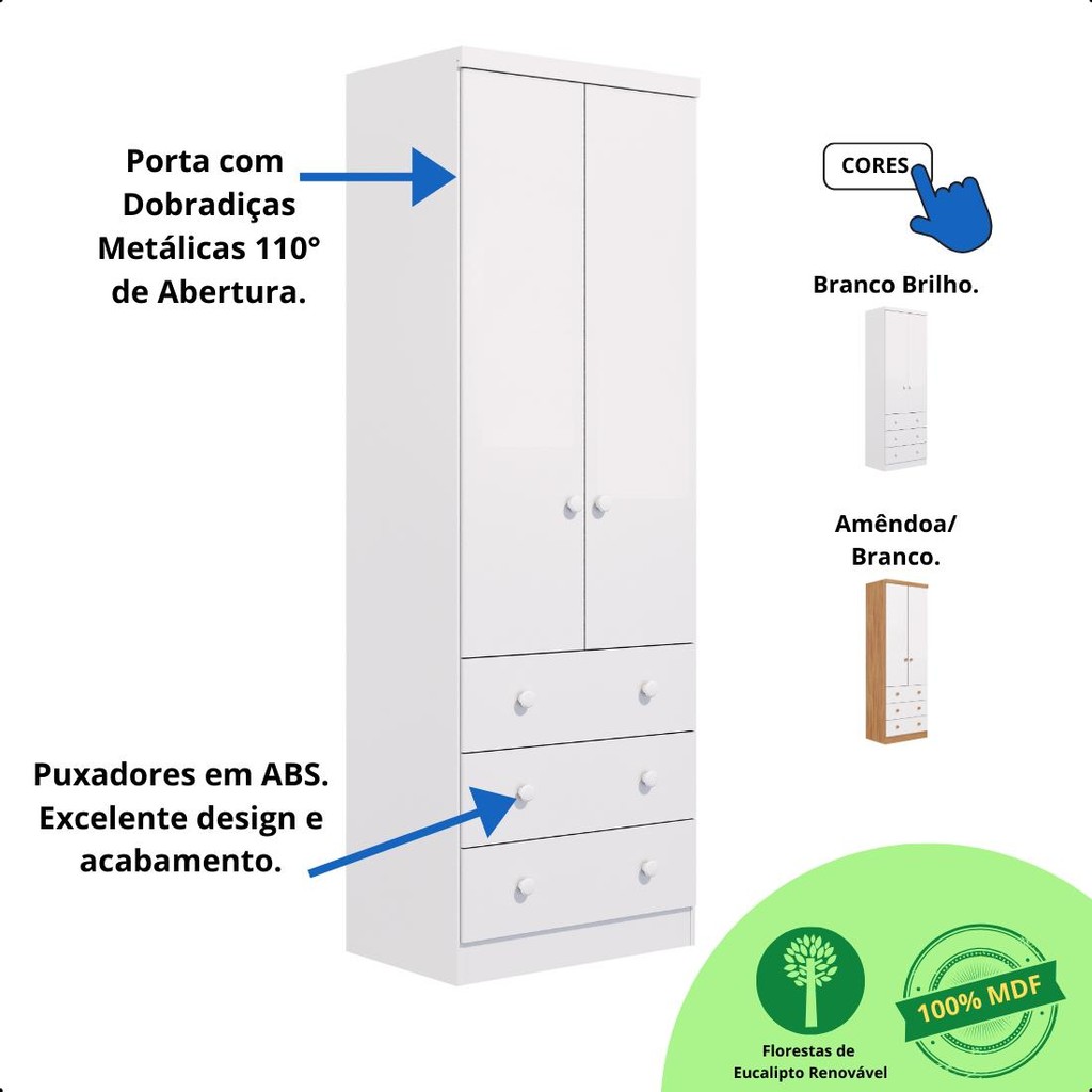 O Roupa 2 Portas e 3 Gavetas Smim da Faura é ideal para quem busca funcionalidade para um ambiente compacto, aliado a custo benefício, qualidade e segurança. O Guarda Roupa Smim atende a diversos ambientes de sua casa, ideal para seu bebê, sua criança e até para uso adulto acompanhando o crescimento podendo ser usado em qualquer faixa de idade. O Guarda Roupa Smim 02 e portas e 03 gavetas é um produto 100% MDF, sua pintura é atóxica, possui cabideiro metálico e puxadores em ABS. FICHA TÉCNICA -Guarda Roupa Infantil Smim Altura: 183 cm Largura: 61,7 cm Profundidade: 41,5 cm Quantidade de Gavetas: 03 Gavetas ( Peso suportado 4Kg) Quantidade de Portas: 02 Portas Material: 100% MDF Cores Disponíveis: Branco Brilho e Amêndoa/Branco. Acabamento do Produto: Pintura UV Atóxica/ Pintura PU e Fita de Bordo Tipo de Corrediça: Telescópica Tipo de Cabideiro: Metálico Tipo de Puxadores: ABS revestidos -Manual de Montagem: Manual segue na embalagem do produto Os entregadores não estão autorizados a subir escadas ou elevadores, realizando a entrega apenas na recepção ou portaria, conforme as normas trabalhistas dos transportadores. Recomendamos que os clientes considerem essa limitação ao realizar suas compras. Imagens meramente ilustrativas: a decoração não acompanham o produto. -Recomendações de Uso, Manutenção e Limpeza: Para limpeza utilize somente pano limpo e macio, ligeiramente umedecido em água, seguido de um pano seco. Perguntas Frequentes: A - É fácil montar o Guarda Roupa Infantil Smim? Sim, é fácil. Ao abrir a embalagem pode parecer complicado, mas é só seguir o passo a passo no manual de montagem que você consegue! B - Tenho a opção de comprar o Berço e Cômoda Infantil Smim separados? Sim, só buscar aqui no site que vai encontrar nossa oferta. C - Qual a configuração da Guarda Roupa Infantil Smim? É um Guarda Roupa Infantil com 2 portas 3 gavetas. D - Como organizar a Guarda Roupa Infantil Smim? Você vai naturalmente encontrar a melhor maneira de organizar seu Guarda Roupa Infantil. Entretanto, vale a pena pontuar algumas situações: 1-A Guarda Roupa Infantil deve estar sempre limpo; 2-Primeira Gaveta: Utilize para os produtos de Higiene do bebê; 3-Demais Gavetas: Utilize para roupas e acessórios do bebê.