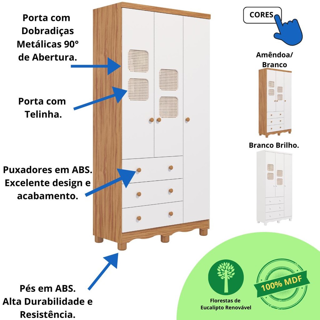 O Guarda Roupa Uli Telinha 03 portas é um produto 100% MDF, sua pintura é atóxica, possui cabideiro metálico, puxadores ABS, corrediças Telescópicas, pés em ABS, 02 modelos de rodapé inclusos e portas com telinha. Versátil e atemporal, ele combina com qualquer decoração e dá um UP na organização do quarto do seu bebê. Ideal para organizar roupas, calçados, acessórios e outros itens essenciais à rotina diária com o seu pequeno(a). Ficha Técnica -Altura: 188cm; -Largura: 92cm; -Profundidade: 41cm; -Quantidade de Gavetas: 03 Gavetas(Peso suportado 4Kg); -Quantidade de Portas: 03 Portas; -Material: 100% MDF; -Cores Disponíveis: Branco Brilho e Amêndoa/Branco; -Acabamento do Produto: Pintura UV Atóxica/ Pintura PU e Fita de Bordo; -Acabamento das Portas: Telinha; -Tipo de Corrediça: Telescópicas; -Tipo de Cabideiro: Metálico; -Tipo de Puxadores: ABS; -Tipo de Pés: ABS(Altura 6cm); - Manual de Montagem: Manual segue na embalagem do produto - Os entregadores não estão autorizados a subir escadas ou elevadores, realizando a entrega apenas na recepção ou portaria, conforme as normas trabalhistas dos transportadores. Recomendamos que os clientes considerem essa limitação ao realizar suas compras. - Imagens meramente ilustrativas: a decoração não acompanham o produto. - Recomendações de Uso, Manutenção e Limpeza: Para limpeza utilize somente pano limpo e macio, ligeiramente umedecido em água, seguido de um pano seco. Perguntas Frequentes: A - É fácil montar o Guarda Roupa Infantil Telinha? R - Sim, é fácil. Ao abrir a embalagem pode parecer complicado, mas é só seguir o passo a passo no manual de montagem que você consegue! B - De qual material é feita a telinha de Rattan? R - A telinha de Rattan é feita de material Sintético . C - Qual a configuração do Guarda Roupa Infantil Uli Telinha? R - É um Guarda Roupa Infantil com 3 gavetas e 3 portas. D - Como organizar o Guarda Roupa Infantil Uli Telinha? R - Você vai naturalmente encontrar a melhor maneira de organizar seu guarda-roupa. Entretanto, vale a pena pontuar algumas situações: 1-O Guarda Roupa deve estar sempre limpo; 2-Primeira Gaveta: Utilize para os produtos de higiene do bebê; 3-Demais Gavetas: Utilize para roupas e acessórios do bebê; 4-Nas outras partes do guarda-roupa, acomode roupas que ficarão no cabideiro, acessórios e outros itens essenciais à rotina.