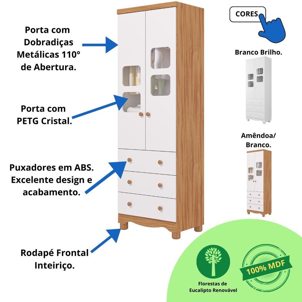 O Roupa Uli 2 Portas e 3 Gavetas é ideal para quem busca funcionalidade e Design para um ambiente compacto, aliado a custo benefício, qualidade e segurança. O Guarda Roupa Uli atende a diversos ambientes de sua casa, ideal para seu bebê, sua criança e até para uso adulto acompanhando o crescimento, podendo ser usado em qualquer faixa de idade. O Guarda Roupa Uli 2 portas com PETG cristal e 3 gavetas. É um produto 100% MDF, sua pintura é atóxica, possui cabideiro metálico e puxadores em ABS. Corra e garanta já o seu, não perca tempo. FICHA TÉCNICA -Guarda Roupa Infantil Uli 2 portas -Altura: 188cm -Largura: 61,7cm -Profundidade: 41,8cm -Material: 100% MDF -Cores Disponíveis: Branco Brilho, Amêndoa/Branco; -Quantidade de Gavetas: 03 Gavetas(Peso suportado 4Kg); -Quantidade de Portas: 02 Portas com PETG cristal; -Acabamento do Produto: Pintura UV Atóxica/ Pintura PU e Fita de Bordo; -Tipo de Corrediça: Telescópica; -Tipo de Cabideiro: Metálico; -Tipo de Puxadores: ABS revestidos; -Rodapé: 1 Reto e 1 Ondulado; -Manual de Montagem: Manual segue na embalagem do produto - Os entregadores não estão autorizados a subir escadas ou elevadores, realizando a entrega apenas na recepção ou portaria, conforme as normas trabalhistas dos transportadores. Recomendamos que os clientes considerem essa limitação ao realizar suas compras. - Imagens meramente ilustrativas: a decoração não acompanham o produto. -Recomendações de Uso, Manutenção e Limpeza: Para limpeza utilize somente pano limpo e macio, ligeiramente umedecido em água, seguido de um pano seco. Perguntas Frequentes: A - É fácil montar o Guarda Roupa Infantil Uli 2 portas? R - Sim, é fácil. Ao abrir a embalagem pode parecer complicado, mas é só seguir o passo a passo no manual de montagem que você consegue! B - Qual a configuração da Guarda Roupa Infantil Uli 2 portas? R - É um Guarda Roupa Infantil com 2 portas com PETG cristal e 3 gavetas. C - Como organizar a Guarda Roupa Infantil Uli 2 portas? R - Você vai naturalmente encontrar a melhor maneira de organizar seu Guarda Roupa Infantil. Entretanto, vale a pena pontuar algumas situações: 1-A Guarda Roupa Infantil deve estar sempre limpo*; 2-Primeira Gaveta: Utilize para os produtos de Higiene do bebê; 3-Demais Gavetas: Utilize para roupas e acessórios do bebê.