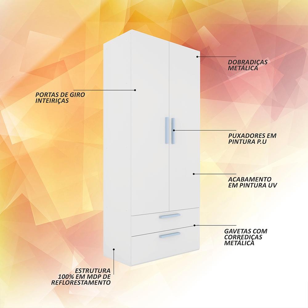 Com o Guarda Roupa Infantil Modulado com Puff Baú Joy você tem o cantinho dos sonhos com organização! Com ele você transmite aconchego e harmonia. Um quarto mais funcional e encantador. Detalhes Técnicos Medidas do Produto Montado: A: 220cm x L: 160cm x P: 47cm - MDP 15mm e 25mm - Acabamento em Pintura UV - Tonalidade: Branco/Azul/Linho Bege - Puxadores: MDF 18mm - Cabideiro interno: Alumínio -Cabideiro Externo: Metalon em pintura Epóx preto - Gavetas com Corrediças Metálicas - Prateleiras suportam até 5kg distribuídos - Gavetas suportam até 3kg distribuídos - Puff Baú suporta até 80kg distribuídos - Assento do Puff removível no tecido Linho Bege Conteúdo da Embalagem: - 01 Guarda Roupa - 01 Modulado 2 portas com Puff Baú - Manual de Montagem - Acessórios para Montagem Observações Importantes - Imagens ambientadas meramente ilustrativas, objetos decorativos não compõe o produto; - Produto novo, garantia somente para defeitos de fabricação: 3 meses; - Não realizamos entregas em zonas rurais, via caminhos fluviais e distritos, NÃO ACEITAMOS CEP GERAL; - Não trabalhamos com entrega agendada. O recebedor deve ter mais de 18 anos. O valor do frete não inclui: subida de escada, elevador ou lançamento de produto, em condomínio residencial a entrega é feita somente até a portaria. As entregas são realizadas em dias e horários comerciais; - Ao receber o produto observe se a embalagem está em perfeita condição. Confira atentamente a quantidade de volumes; - Produto entregue desmontado. É responsabilidade do cliente a montagem/instalação do produto, inclusive despesa para sua realização. Recomendamos a contratação de um profissional especializado; - Evitar a exposição direta à luz solar e à umidade. Limpar com pano macio e seco, não utilizar produtos químicos; - A cor do produto pode variar de acordo com o monitor, a iluminação do ambiente ou sua percepção visual.