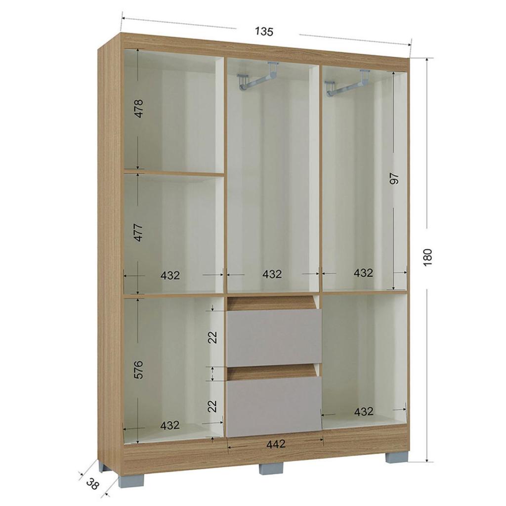 Descrição O Roupeiro Napoles é um produto de alta qualidade, fabricado em MDP de 15 mm, oferecendo resistência, durabilidade e excelente aproveitamento interno. Com um design funcional, possui portas e gavetas robustas que facilitam a organização de roupas, calçados e acessórios, sendo ideal para quem busca praticidade no dia a dia. Diferenciais • Estrutura em MDP de 15 mm • Amplo espaço interno para organização • Portas com dobradiças metálicas • Gavetas com corrediças metálicas • Cabideiro incluso para maior praticidade Informações Técnicas • Material: MDP 15 mm • Portas: 6 portas com dobradiças metálicas • Gavetas: 2 gavetas com corrediças metálicas • Puxadores: MDF • Cabideiro: Incluso • Pés: Plástico Dimensões • Altura: 180 cm • Largura: 135 cm • Profundidade: 38 cm • Peso: 61,1 kg Conteúdo da Embalagem • 1 Roupeiro Napoles (desmontado) • Manual de montagem
