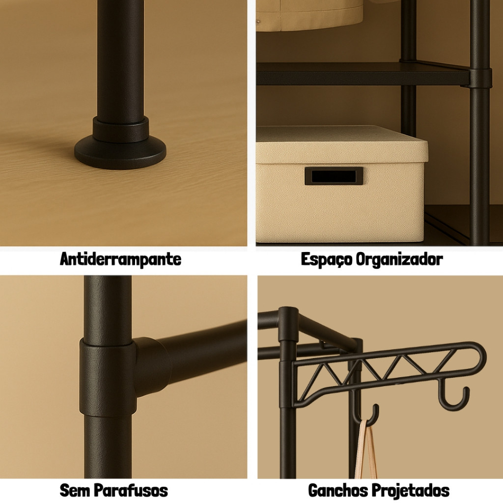 Armário Portátil com Cabideiro Quádruplo – Praticidade e Design em um Só Produto Transforme qualquer espaço em um ambiente funcional e elegante com o Armário Portátil com Cabideiro Quádruplo. Ideal para quem busca organização sem abrir mão do estilo, este armário oferece uma solução completa para armazenar roupas, calçados, bolsas e acessórios com praticidade e segurança. Produto vai ser enviado desmontado Tamanho da caixa: 60cm X 35cm X 10cm Diferenciais que Fazem a Diferença: Alta Capacidade de Organização Com quatro seções de cabideiro, múltiplas prateleiras e divisórias têxteis, o armário permite armazenar e exibir suas roupas de forma prática e eficiente, mantendo tudo visível e ao seu alcance. Design Versátil e Inteligente Ideal para quartos, closets, lavanderias e até mesmo uso temporário em viagens ou eventos. Seu visual moderno com estrutura metálica combina com qualquer decoração, proporcionando um toque de sofisticação ao ambiente. Montagem Simples e Sem Complicações A estrutura modular é de fácil encaixe, dispensando o uso de ferramentas. O manual de instruções acompanha o produto e permite uma montagem rápida, mesmo para quem não tem experiência. Estrutura Reforçada e Segura Produzido com aço de alta resistência e conectores em plástico durável, o armário suporta até 50kg de carga distribuída. O sistema de travamento lateral nos cabideiros oferece segurança extra, evitando que suas roupas escorreguem ou caiam. Espaço Inteligente com Divisórias Funcionais ideais para calçados, roupas dobradas, caixas organizadoras e muito mais. Itens Inclusos na Embalagem: - 106 tubos de aço reforçado - 48 conectores plásticos - 8 suportes para cabideiro - 10 prateleiras de tecido resistente - 2 suportes laterais com gancho integrado - 10 encaixes de base - 1 manual de montagem detalhado Ideal Para: - Quartos e suítes - Closets e lavanderias - Lojas e expositores temporários - Uso temporário em viagens ou eventos Por Que Escolher Este Armário? Combina eficiência de organização, estética minimalista e estrutura durável Substitui guarda-roupas convencionais em espaços compactos Montagem rápida, sem ferramentas e com alta mobilidade Excelente custo-benefício para quem precisa de praticidade no dia a dia Informações Técnicas: Material: Aço inoxidável e plástico resistente Capacidade máxima: 50kg (distribuídos) Ganchos para cabide: 4 unidades Funções: Cabideiro, arara, sapateira, rack, organizador portátil ****Inclui: 01 x Arara Organizadora 4 Divisórias(Branco / Preto) - Tamanho : 213x36x173cm (C x L x A) -----------------------ou------------------------- 01 x Arara Organizadora 3 Divisórias(Branco / Preto) - Tamanho : 160*36*173cm (C x L x A)