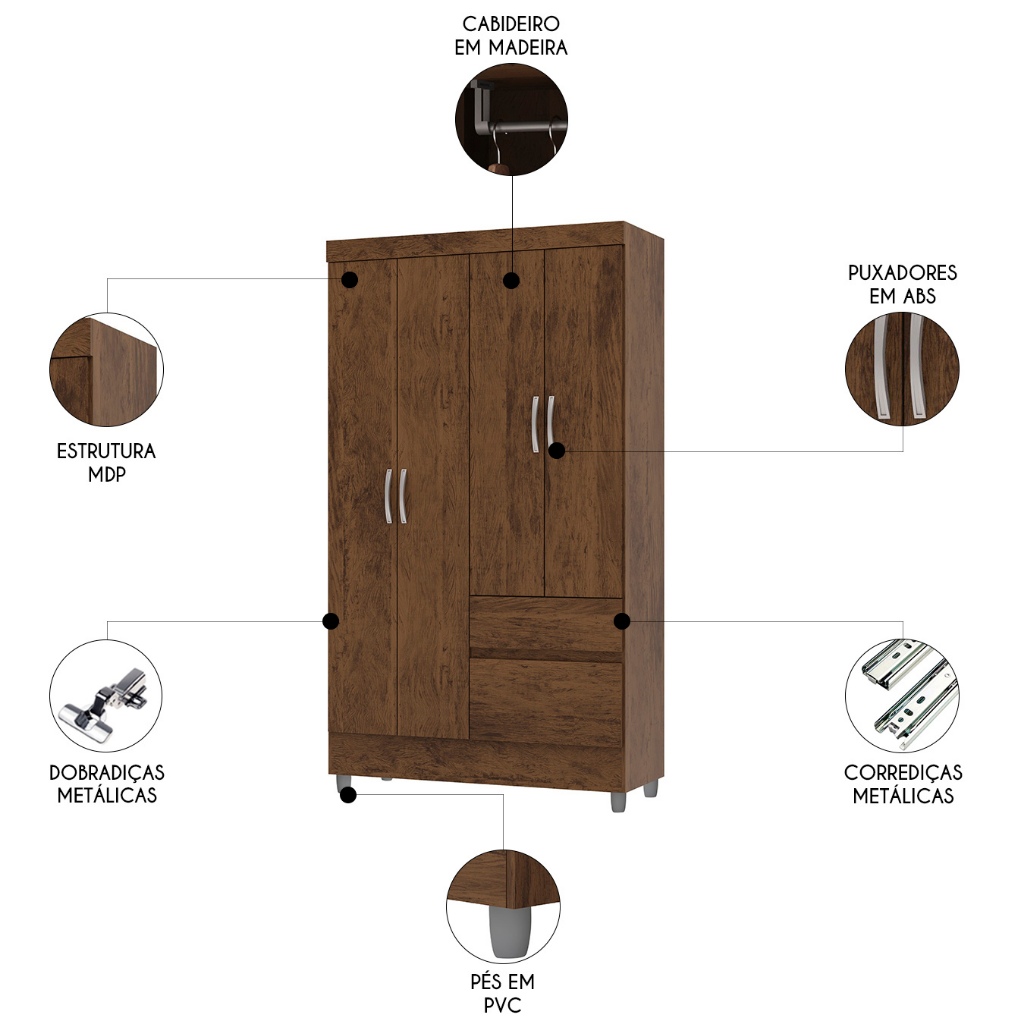 Guarda Roupa Solteiro 103cm 4 Portas Mayra Imbuia Rústico V02 - Mpozenato
