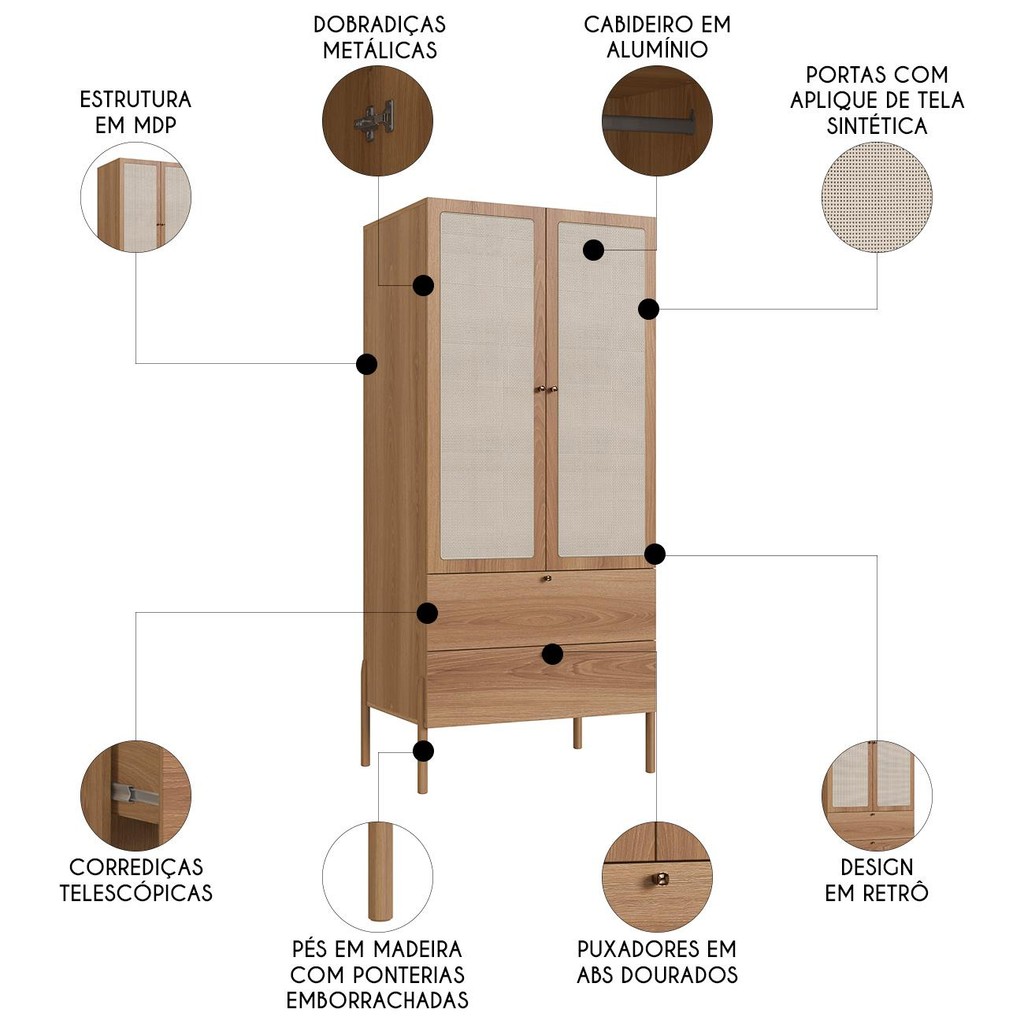 Guarda Roupa Solteiro 80cm Com 2 Portas Arlo Hanover A10 - Mpozenato O Guarda Roupa Solteiro de duas portas e duas gavetas combina funcionalidade e estilo em um design contemporâneo. Fabricado em MDP de 15 mm, oferece resistência e durabilidade para o dia a dia, garantindo estabilidade sem comprometer a leveza do móvel. O acabamento em BP fosco proporciona uma superfície elegante e fácil de limpar, além de reforçar a proteção. Seu visual discreto é perfeito para compor o ambiente do seu Quarto, deixando-o mais moderno e acolhedor. Destaque especial para os pés em madeira maciça, que conferem charme natural e robustez à peça, além de facilitar a limpeza do espaço. As portas recebem um delicado aplique de tela sintética, acrescentando textura e sofisticação ao design. Com uma paleta de cores neutras, o Guarda Roupa se integra facilmente a diferentes estilos de decoração, promovendo um ambiente harmonioso e atemporal. Ideal para quem busca praticidade sem abrir mão da estética. ESPECIFICAÇÕES Dimensões do Produto Largura: 80 cm. Altura: 180 cm. Profundidade: 57 cm. Peso: 60,2 Kg. Características do Produto Material da Estrutura: MDP. Espessura das Chapas: 15mm. Material do Fundo: MDP 3mm. Peso Suportado: 40 kg distribuídos. Acabamento: Pintura BP. Escala de Brilho: Fosco. Quantidade de Portas: 2 Portas. Material da Dobradiça: Metal. Tipo de Porta: Convencional. Possui Cabideiros: Sim. Quantidade de Cabideiro: 1 Cabideiro. Material do Cabideiro: Alumínio. Possui Gaveta: Sim. Quantidade de Gavetas: 2 Gavetas. Tipo de Corrediças: Telescópicas. Material do Puxador: Plástico ABS. Possui Prateleiras: Sim. Quantidade de Prateleiras: 1 Prateleira. Possui Pés: Sim. Quantidade de Pés: 4 Pés. Material dos Pés: Madeira. Possui Espelho: Não. Diferenciais: - Portas com aplique de tela sintética. - Corrediças telescópicas. - Design retrô. - Portas com dobradiças metálicas. - Acabamento BP. - Puxadores com acabamento na cor dourada. - Pés com ponteiras emborrachada. Sistema de Montagem: Cavilhas/Parafusos/Pregos/Minifix. Manual de Montagem: Sim. Complexidade da Montagem: Média. Volumes: 2 Volumes. Conteúdo da embalagem: 1 Guarda Roupa. Garantia do Fabricante: 90 dias contra defeito de fabricação. Montagem: Recomendamos que seja feita por um profissional. Recomendação de Limpeza: Utilize pano levemente úmido. Observações importantes: - Produto para uso residencial em ambiente interno, não devendo ficar exposto diretamente ao sol, calor e umidades excessivas. - Pode haver alguma diferença de tonalidade entre a imagem e o produto real, por conta do tratamento de imagens e a calibração de cores do seu monitor. - As imagens são meramente ilustrativas, não acompanham objetos de decoração e eletrônicos. - Confira o estado da embalagem, não devendo assinar o comprovante em caso de danos. - Não asseguramos, no ato da entrega, por subir escadas/elevadores, pelo transporte por guincho em apartamentos ou montagem, desmontagem e instalações. Eventuais despesas são por conta do comprador. - Confira as dimensões do produto e certifique-se de que passará normalmente por supostos elevadores, portas, escadas e/ou corredores de sua residência.