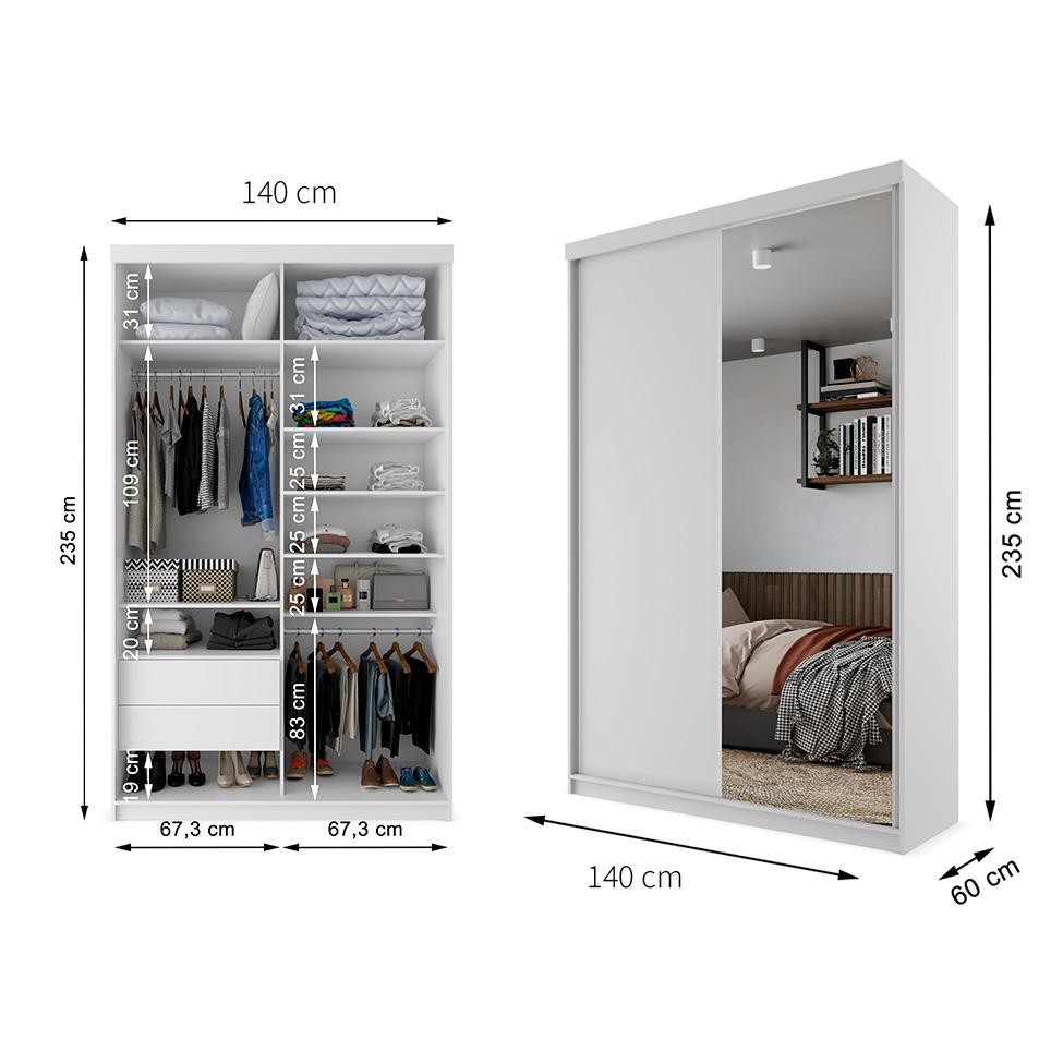 Que tal o Guarda-Roupa Geneve? Com visual elegante, o Guarda-Roupa Geneve encherá seu dormitório de sofisticação. Com 2 portas e 2 gavetas, ele é perfeito para o quarto de solteiro, já que tem ótimo espaços para você organizar tudo à sua maneira. Feito em materiais resistentes e duráveis, o móvel tem portas de correr e espelho de corpo inteiro, assim você otimiza o espaço no cômodo e ainda garante que o look esteja sempre em dia. Ah, as portas contam com sistema anti descarrilhamento. Perfeito, né? Cor: Branco Garantia em Meses: 3 Cores do Produto: Branco Instruções/Cuidados: Limpeza com pano levemente umedecido Conteúdo da Embalagem: 1 Guarda-Roupa - Entregue em: 4 Volumes Modelo: Geneve Número de Volumes: 4 Material: O Guarda-Roupa Geneve possui estrutura em MDF 15 mm, espelho comum 3 mm, trilhos em alumínio, corrediças telescópicas, puxadores em alumínio, cabideiro em alumínio e acabamento fosco Material para Filtro: MDF Descrição do Tamanho: Altura: 235 cm | Largura: 140 cm | Profundidade: 60 cm Altura do Produto (cm): 235 Largura do Produto (cm): 140 Comprimento do Produto (cm): 60 Peso do Produto (Kg): 140 Produto precisa de Montagem?: Sim, sugerimos a contratação do nosso serviço de montagem (para os CEPs em que o serviço está disponível) ou de algum profissional experiente de sua preferência Divisória de Espaço: 0 Tipo de Guarda-Roupas: Solteiro Gaveta com Divisórias: 0 Gaveta com trava: 0 Sapatas: 0 Cabideiro: 0 Número de portas: 2 Número de gavetas: 2 Número de Prateleiras: 7 Material da dobradiça/trilho da porta: Alumínio Material da estrutura: MDF Material do cabideiro: Alumínio Material do fundo: HDF Material do puxador: Alumínio Necessita fixação na parede: Não Possui espelho/vidro: Sim Tipo da Corrediça da gaveta: Telescópica Tipo de Porta: Correr PROFUNDIDADE x LARGURA x ALTURA: 60 x 140 x 235 Fornecedor: RR Industria e Comercio de Moveis LTDA Baterias são necessárias?: Não Certificação de teste externa: Não Componentes incluídos: Não Is Fragile: Não Número da peça: Não Inclui Manual de Montagem: Sim