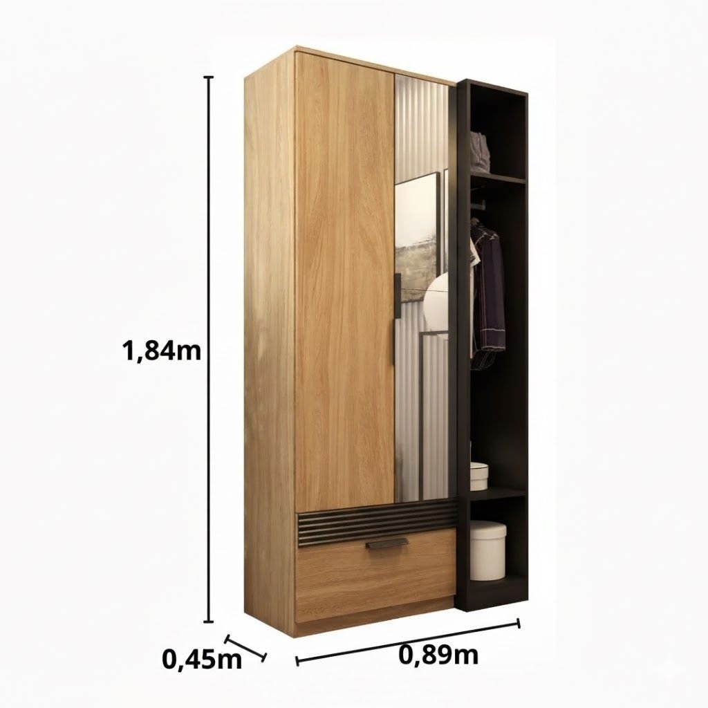 O guarda roupa Capri é moderno, prático e funcional! Se adapta a qualquer ambiente, seja ele o seu quarto, cozinha ou área de serviço. Ideal para guardar roupas, calçados, produtos de limpeza e higiene, é muito bem dividido. Possui 4 prateleiras internas e mais 2 externas. Na parte inferior conta com 1 gaveta com corrediça metálica, e um lindo aplique ripado que da um charme ao produto. Na parte do nicho, possui um cabideiro super útil para acomodar roupas. Este móvel é produzido 100% em MDP e acompanha kit de espelhos.! Estilo: Moderno Modular: Não Peso (kg): 48.1 Garantia: 03 Meses Altura (cm): 184 Acabamento: Pintura UV Largura (cm): 89 Possui Pés: Rodapé Altura dos Pés: 5 Tipo de Gaveta: Externa Possui Espelhos: Sim Profundidade (cm): 45 Escala de Brilho: Fosco Possui Calceiros: Não Material da Porta: MDP Origem do Produto: Nacional Possui Cabideiros: Sim Ambiente Principal: Quarto Formato do Espelho: Retangular Material da Gaveta: MDP Material Principal: MDP Acabamento da Porta: Pintura UV Nicho com Cabideiro: Sim Acabamento da Gaveta: Pintura UV Espessura do Espelho: 3 Tipo de Guarda-roupa: Solteiro Espessura do Fundo (mm): 3 Material da Prateleira: MDP Peso Máximo por Gaveta: 5 Quantidade de Espelhos: 02 Espelhos com Tamanhos Iguais Espessura das Portas (mm): 15 Acabamento da Prateleira: Pintura UV Tipo de Puxador da Porta: Externo Escala de Brilho da Porta: Fosco Espessura da Estrutura (mm): 12 Tipo de Puxador da Gaveta: Externo Escala de Brilho da Gaveta: Fosco Peso Máximo por Prateleira: 5 Tipo de Corrediça da Gaveta: Metálica Simples Espessura das Prateleiras (mm): 12 Material do Puxador da Porta: ABS Possui Organizador de Gaveta: Não Escala de Brilho da Prateleira: Fosco Espessura do Fundo das Gavetas (mm): 3 Tipo de Dobradiça/Corrediça da Porta: Metálica Marca: Marafon Móveis Tonalidade: Preto / Marrom Cor Interna: Amêndoa Cor: Amêndoa/Preto Cor do Produto: Amêndoa/Preto Itens Inclusos: 1 Guarda Roupa, 1 Kit de Espelhos, Kit Ferragens e Manual de Montagem Cor Predominante: Marrom Linha ou Coleção: Capri Quantidade de Cabideiros: 01 Cabideiro