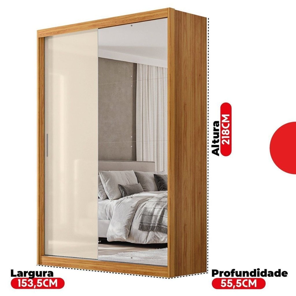 O Guarda-Roupa London é a solução ideal para quem busca organização e estilo em um só móvel. Com um design moderno e funcional, ele otimiza o espaço do seu quarto, oferecendo praticidade para o dia a dia e valorizando sua decoração. - Design Inteligente com Portas de Correr: Ideal para otimizar o espaço, suas portas deslizantes permitem fácil acesso mesmo em ambientes compactos. Uma das portas conta com um espelho retangular, oferecendo praticidade para o dia a dia e ajudando a criar uma sensação de maior amplitude no cômodo. - **Amplo Espaço Interno:** Organize tudo de forma prática com 1 cabideiro para peças longas, 4 gavetas internas para guardar roupas íntimas e acessórios, e 4 prateleiras para acomodar sapatos, caixas e roupas dobradas. - **Dimensões Pensadas para seu Espaço:** Com 218 cm de altura, 153,5 cm de largura e 55,5 cm de profundidade, este guarda-roupa oferece uma excelente capacidade de armazenamento, adaptando-se bem a diferentes tamanhos de quartos. - Acabamento de Alta Qualidade: Acabamento com textura Touch que remete à naturalidade da madeira, conferindo um visual sofisticado e um toque agradável ao móvel. Para uma compra certeira: Os itens decorativos das imagens não fazem parte do produto. Confirme se as medidas cabem no seu ambiente, considerando uma pequena folga de até 2 cm para manuseio. Estilo: Moderno Modular: Não Peso (kg): 119.88 Garantia: 03 Meses Altura (cm): 218 Largura (cm): 153.5 Possui Pés: Não Possui Gancho: Não Possui Nichos: Não Possui Portas: Sim Tipo de Porta: Correr Porta Janelada: Não Possui Gavetas: Sim Suporta Até (kg): 55 Tipo de Gaveta: Interna Possui Espelhos: Sim Profundidade (cm): 55.5 Escala de Brilho: Semi-Brilho Gaveta com Chave: Sim Possui Calceiros: Não Possui Capelinha: Não Possui Sapateira: Não Material da Porta: MDF Origem do Produto: Nacional Possui Cabideiros: Sim Possui Iluminação: Não Ambiente Principal: Quarto Formato do Espelho: Retangular Material da Gaveta: MDF Material Principal: MDF Possui Penteadeira: Não Possui Prateleiras: Sim Acabamento da Porta: Pintura UV Nicho com Cabideiro: Não Acabamento da Gaveta: Pintura UV Tipo de Guarda-roupa: Solteiro Espessura do Fundo (mm): 3 Material da Prateleira: MDF Peso Máximo por Gaveta: 3 Possui Espelho Interno: Não Quantidade de Espelhos: 04 Espelhos com Tamanhos Iguais Espessura das Portas (mm): 12 Acabamento da Prateleira: Pintura UV Tipo de Puxador da Porta: Externo Escala de Brilho da Porta: Fosco Espessura da Estrutura (mm): 12 Tipo de Puxador da Gaveta: Não Possui Escala de Brilho da Gaveta: Fosco Peso Máximo por Prateleira: 5 Tipo de Corrediça da Gaveta: Metálica Telescópica Espessura das Prateleiras (mm): 12 Material do Puxador da Porta: ABS Possui Organizador de Gaveta: Não Escala de Brilho da Prateleira: Fosco Informações Complementares (Novo): As cores do produto podem sofrer variações de tonalidade de acordo com as configurações do seu dispositivo. Espessura do Fundo das Gavetas (mm): 3 Possui Espaço para Vestidos Longos: Não Tipo de Dobradiça/Corrediça da Porta: Alumínio Marca: Demóbile Cor Flex: Não Cor Interna: Cinamon Cor: Cinamon/Off White Cor do Produto: Cinamon/Off-White Itens Inclusos: 01 Guarda-Roupa + Acessórios 1 Manual de Montagem Cor Predominante: Amarelo Linha ou Coleção: London Quantidade de Cabideiros: 01 Cabideiro Quantidade de Prateleiras: 04 Prateleiras Quantidade de Portas: 2 Portas Quantidade de Gavetas: 04 Gavetas Quantidade de Portas com Espelhos: 1 Porta com Espelho