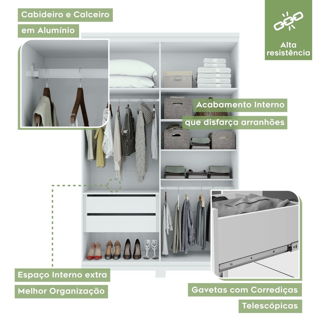 Guarda Roupa Solteiro com Espelho 4 Portas 2 Gavetas Alonzo 100% MDF Branco