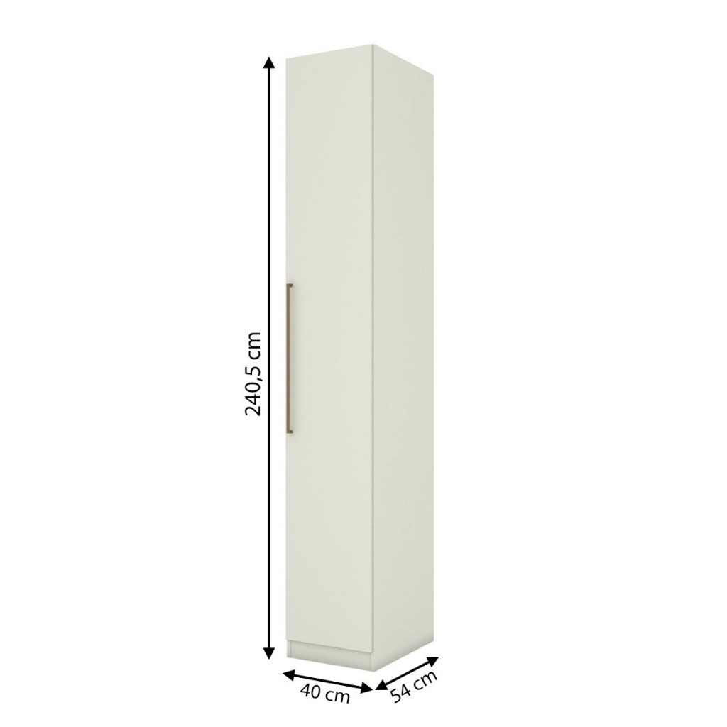Dimensões: - Altura: 240,50 cm - Largura: 40,00 cm - Profundidade: 54,00 cm - Peso: 48,500 kg Descrição: O(a) Guarda-Roupa Solteiro Modulado Seletto 1 Porta Areia - Henn é produzido em MDP na escala de brilho Fosco, e possui um grau de dificuldade de montagem: Médio. Seu revestimento/acabamento é: Texturizada. Infelizmente a Loja não oferece serviço de montagem, deixamos essa informação bem clara em todas as nossas páginas de produto. Onde especificamos que os móveis chegarão desmontados, e que a montagem fica por conta do cliente. Como não oferecemos esse serviço não embutimos o mesmo no preço dos produtos, ou seja, maior economia para você! Todos os nossos móveis também acompanham o manual de montagem, e caso você queira, pode realizar a montagem você mesmo, sempre especificamos os graus de montagem dos produtos. Nos casos de grau baixo e médio, com pouco ou nenhum conhecimento, você mesmo pode efetuar a montagem, e fazer essa economia. Apenas nos graus de montagem alto, recomendamos a contratação de um montador com experiência, visto que são montagens mais complicadas. A montagem é feita com Parafusos, cavilhas e Minifix.. Este móvel é indicado para que seja utilizado no(a) Quarto, dando um toque especial no cômodo de sua casa. Para que você mantenha seu produto sempre em ótimo estado, recomendamos que use apenas um pano seco ou levemente umedecido, sem o uso de quaisquer produtos abrasivos. A Loja garante aos clientes, 90 dias de garantia nos produtos, porém, recomendamos que entre em contato com o fornecedor/marca do produto, pois o mesmo(a), pode garantir um prazo maior de garantia. Lembrando ainda que: quaisquer objetos decorativos que aparecem nas imagens, não acompanham o produto. Características: - Espessura da Estrutura: "Caixa: MDP 15mm Frente: BP 15mm Interno: MDP 15mm Fundo: MDF 3mm" - Possui Gavetas?: Não - Possui Portas?: Sim - Quantidade de Portas: 1 - Material da Porta: MDP - Espessura da Porta: 15 mm - Tipo de Porta: Portas de Bater - Material das Dobradiças: Metálica - Possui Vidro?: Não - Possui Espelho?: Não - Possui Prateleiras?: Sim - Quantidade de Prateleiras: 5 - Peso Suportado nas Prateleiras:: 8 Kg - Possui Puxadores?: Sim - Material do Puxador: Alumínio - Possui Ripamento?: Não - Linha ou Coleção: Seletto - Montagem Invertida?: Não Pode ser Montado Invertido - É frágil?: Não - Possui Nicho?: Não - Material da Estrutura: MDP - Escala de Brilho: Fosco - Possui Rodízios?: Não - Possui Pés?: Não - Acompanha: 1 Guarda Roupa e Instrução de Montagem - Acompanha Manual de Montagem: Sim - Como os Móveis Chegarão na Minha Casa: Desmontado em caixas, acompanhado de todas as peças, ferragens e manuais para montagem. - Grau de Dificuldade da Montagem: Médio - Necessita de Montagem: Sim - Sistema de Montagem: Parafusos, cavilhas e Minifix. - Garantia (dias): 90 - Indicação de Uso: Quarto - Observação: Objetos decorativos que aparecem nas imagens, não acompanham o produto. Pode ser montado com pés ou sem. - Recomendação de Manutenção: Utilizar pano levemente umedecido, seguido de pano seco. Não utilizar quaisquer produtos abrasivos. - Revestimento /Acabamento: Texturizada - Modelo: Solteiro - Tipo de Guarda-Roupa/Closet: Modulado