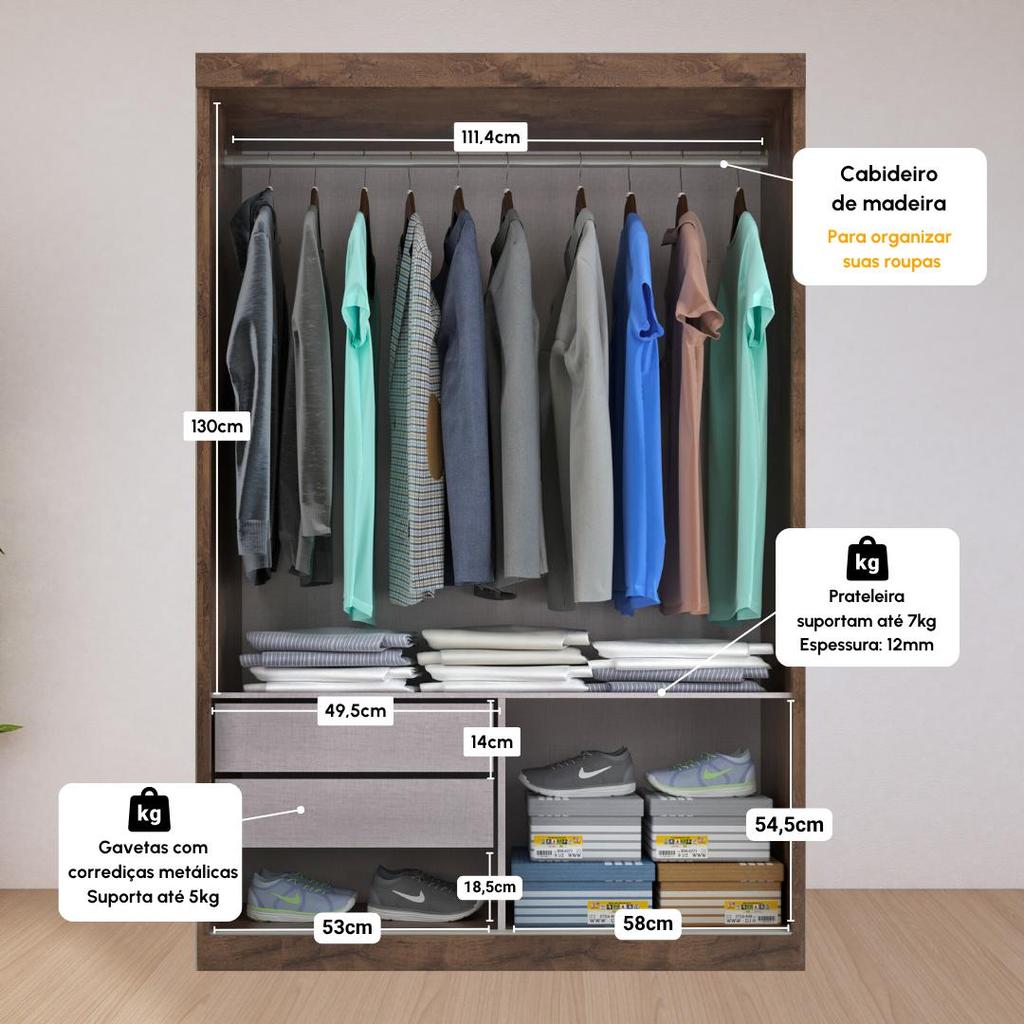 O Guarda-Roupa Roma é a solução perfeita para quem busca organização e funcionalidade em um móvel compacto. Com 2 portas de correr, ele economiza espaço e oferece fácil acesso aos seus pertences. Seu design moderno e bem estruturado permite uma organização eficiente com gavetas, prateleiras e cabideiro. Destaques do Guarda-Roupa Roma: • 2 portas de correr para otimizar o espaço e facilitar o acesso; • 2 gavetas com corrediças metálicas para abertura suave e segura; • 1 cabideiro para organização de roupas; • Fabricado em MDP de alta durabilidade; • Acabamento Touch Alto-Relevo ou Alto Brilho UV; • Portas Flex: Chocolate/Offwhite (flexíveis) e Ônix (preto fosco); • Manual de montagem incluso; Medidas do Guarda-Roupa Roma: • Altura: 200 cm • Largura: 114 cm • Profundidade: 45 cm • Peso: 63 kg Medida das gavetas: • Frente: 49,5 cm de largura • Altura: 14 cm • Profundidade: 33,8 cm Importante: Não nos responsabilizamos pela montagem ou instalação do produto. Recomendamos a contratação de um profissional especializado. (imagens meramente ilustrativas)