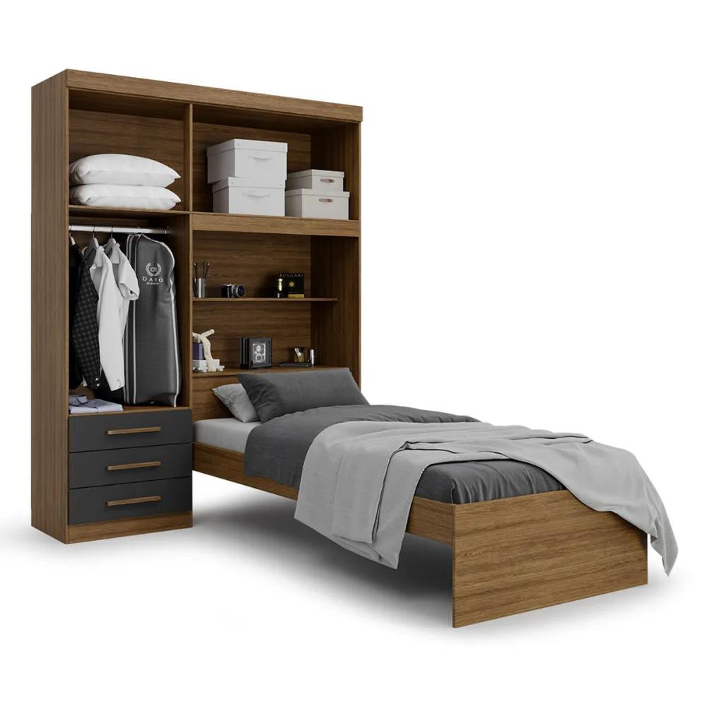 Guarda Roupa Solteiro Turim com Cama e Cabeceira Bau Ipe Wood Grafite Batrol