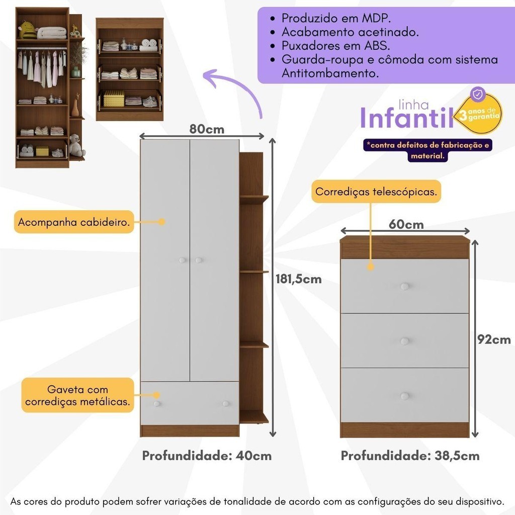 O Guarda-Roupas 2 Portas 1 Gaveta com Cômoda 3 Gavetas Infantil Doce de Leite Multimóveis MP4243 é essencial para manter a organização e harmonia no quarto do seu pequeno. Fabricado em MDP com acabamento acetinado (cerca de 20% de brilho), garante durabilidade e facilidade na limpeza. O guarda-roupas conta com 2 portas, prateleiras internas, dobradiças metálicas, cabideiro (suporta até 3kg) e 1 gaveta (suporta até 3kg) com corrediças metálicas, que proporcionam mais leveza no manuseio. Além disso, possui 4 prateleiras externas que suportam até 2kg em cada e são ideais para apoiar objetos decorativos, embelezando o ambiente. A cômoda de 3 gavetas (suportam até 3kg) conta com corrediças telescópicas, que proporcionam um manuseio suave e silencioso, além de seu tampo suportar até 7kg, sendo perfeito para apoiar objetos que complementam a decoração do ambiente. Acompanha sistema antitombamento que evita acidentes e propicia maior segurança. Os puxadores em ABS deste conjunto são práticos e delicados. Conteúdo da Embalagem: 1 (um) Guarda-roupas 1 (uma) Cômoda Manual de Montagem Kit Ferragem Dimensões do produto montado: Guarda-Roupas - Altura: 181,5cm | Largura: 80cm | Profundidade: 40cm Cômoda - Altura: 92cm | Largura: 60cm | Profundidade: 38,5cm *Você pode consultar as medidas detalhadas na imagem técnica do produto. *Obrigatório fixar os produtos na parede. *As cores do produto podem sofrer variações de tonalidade de acordo com as configurações do seu dispositivo. Aqui na Loja Multimóveis, você pode concluir sua compra facilmente com toda segurança. A entrega é garantida e aqui você está em 1° lugar. Imagem meramente ilustrativa. Decoração não acompanha o produto. O produto será entregue desmontado e não disponibilizamos o serviço de montagem.