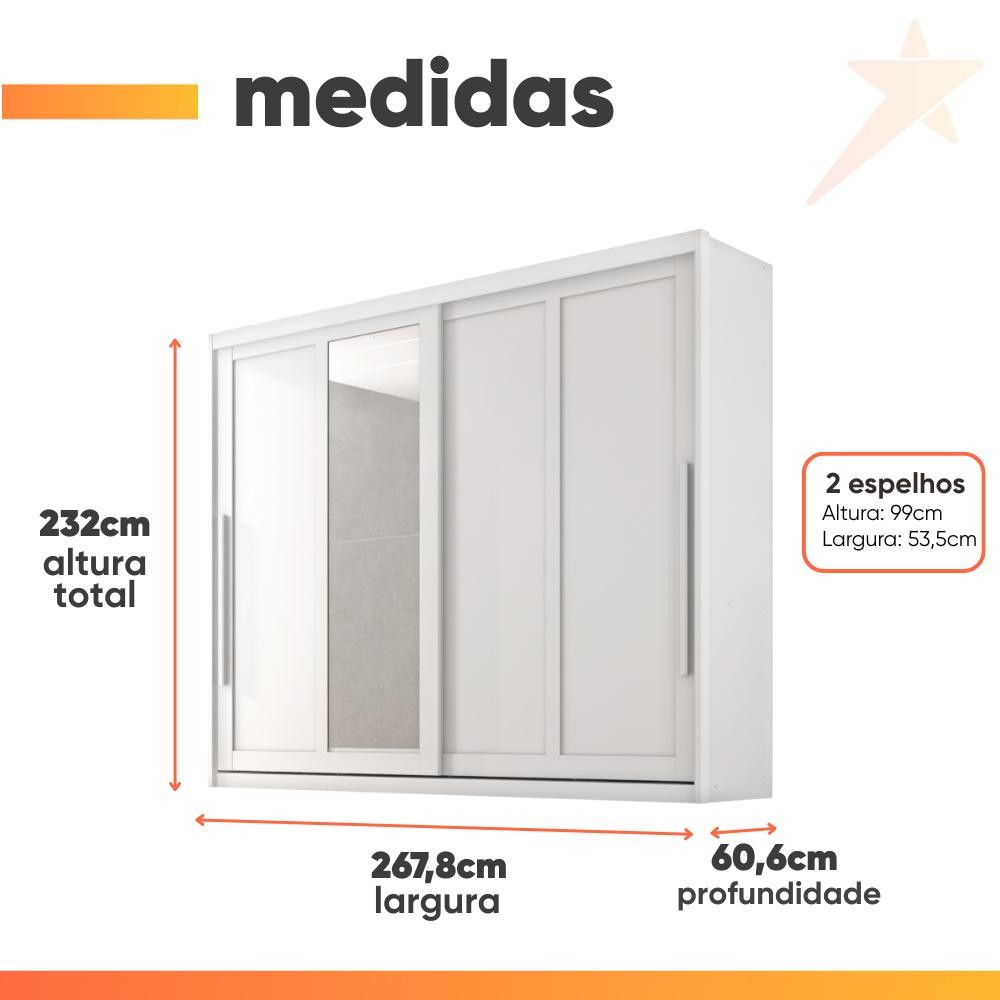 O Guarda Roupas Firenze é a combinação perfeita de beleza, praticidade e resistência. Com 2 portas, sendo uma delas com um espelho amplo que permite uma visualização perfeita do seu look, e 6 gavetas, 3 de cada lado, ele oferece uma organização otimizada e maximiza o espaço de forma eficiente. As gavetas possuem corrediças telescópicas para um fechamento suave e durável. Com cabideiros e espaço para pendurar roupas, o guarda-roupa é prático e funcional. Seu design moderno e elegante, aliado a um acabamento interno e externo uniforme, proporciona um visual sofisticado e harmonioso. Feito com MDF de alta qualidade, garante durabilidade e resistência. Perfeito para quem busca qualidade e estilo para o seu espaço. MEDIDAS: A = 232 cm L = 267,8 cm P = 60,6 cm MEDIDAS DO ESPELHO (cada): A = 99 cm L = 53,5 cm PRATELEIRAS SUPORTAM ATÉ: 5 kg GAVETAS SUPORTAM ATÉ: 3 kg CABIDEIROS SUPORTAM ATÉ: 5 kg PESO: 241 kg GUARDA ROUPAS SUPORTA ATÉ: 114 kg MODELO: Guarda Roupas Casal 2 Portas de Correr com Espelho 6 Gavetas Firenze MARCA: Zanzini TIPO DE PINTURA: Fosco MATERIAL DA ESTRUTURA: MDF ESPESSURA DO MATERIAL DA ESTRUTURA: 15 mm TIPO DE PORTA: Correr, maior praticidade no dia a dia QUANTIDADE DE PORTAS: 2 POSSUI ESPELHO: Sim, 2 QUANTIDADE DE GAVETAS: 6 CORREDIÇAS: Telescópicas QUANTIDADE DE PRATELEIRAS: 15 QUANTIDADE DE CABIDEIROS: 3 MATERIAL DO CABIDEIRO: Metal MATERIAL DO PUXADOR: MDF, PARAFUSADO POSSUI SAPATAS PLÁSTICAS: Sim DIFERENCIAL: Guarda Roupa feito 100% em MDF de alta qualidade, corrediças telescópicas e amplo espelho ITENS INCLUSOS: 1 Guarda Roupa, 1 Manual de montagem, 1 Kit Parafusos. SISTEMA DE MONTAGEM: Parafusos auto atarraxantes, cola, cavilhas, pregos INSTRUÇÕES E CUIDADOS: Para limpeza de seu móvel, use uma flanela limpa e seca. Não utilize produtos químicos que possam danificar o produto. GARANTIA: 3 Meses Importante sobre a entrega: A entrega é realizada até a portaria ou porta de entrada do endereço indicado, desde que o acesso seja permitido. Para locais com portaria, a entrega será feita no piso térreo. Não realizamos montagem, desmontagem, transporte por escadas ou içamento. É responsabilidade do cliente verificar se as dimensões do produto são compatíveis com portas, elevadores e corredores. Evite imprevistos: confira todos os detalhes antes de concluir sua compra.