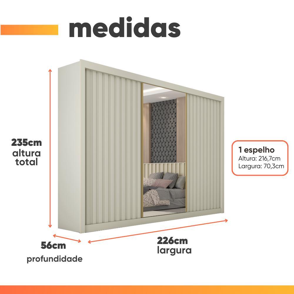 O Guarda Roupas Casal Dublin une elegância e funcionalidade em um só móvel. Com design moderno e sofisticado, o modelo Dublin se destaca pelo detalhe ripado nas portas de correr, aliado ao espelho central integrado, que amplia o ambiente e adiciona um toque de requinte ao quarto. Seu interior foi inteligentemente planejado para proporcionar praticidade no dia a dia, com ampla divisão interna no estilo ele/ela, oferecendo espaços independentes para organização das roupas e acessórios do casal. Possui cabideiros resistentes, prateleiras espaçosas e gavetas amplas com corrediças telescópicas de abertura suave que facilitam a distribuição dos itens de forma funcional e harmônica. Perfeito para quem busca um guarda roupa completo, com excelente capacidade e um visual moderno que valoriza qualquer ambiente. MEDIDAS: A = 235 cm L = 226 cm P = 56 cm MEDIDAS DO ESPELHO: A = 216,7 cm L = 70,3 cm PRATELEIRAS SUPORTAM ATÉ: 4 kg/ 6 kg GAVETAS SUPORTAM ATÉ: 4 kg CABIDEIROS SUPORTAM ATÉ: 12 kg PESO: 228,4 kg GUARDA ROUPAS SUPORTA ATÉ: 110 kg MODELO: Guarda Roupas Casal 3 Portas de Correr com Espelho Ripado 6 Gavetas Dublin MARCA: Europa TIPO DE PINTURA: UV MATERIAL DA ESTRUTURA: MDF ESPESSURA DO MATERIAL DA ESTRUTURA: 15 mm TIPO DE PORTA: Correr, maior praticidade no dia a dia QUANTIDADE DE PORTAS: 3 QUANTIDADE DEGAVETAS: 6 CORREDIÇAS: Telescópicas, abertura suave QUANTIDADE DE PRATELEIRAS: 10 QUANTIDADE DE CABIDEIROS: 2 MATERIAL DO CABIDEIRO: Alumínio POSSUI ESPELHO: Sim MATERIAL DOS PUXADORES: Alumínio, embutidos PÉS: 8 sapatas plásticas DIFERENCIAL: Portas de correr Ripadas com amplo espelho central, corrediças telescópicas de abertura suave. ITENS INCLUSOS: 1 Guarda Roupa, 1 Manual de montagem, 1 Kit Parafusos. SISTEMA DE MONTAGEM: Parafuso, minifix e cavilha INSTRUÇÕES E CUIDADOS: Para limpeza de seu móvel, use uma flanela limpa e seca. Não utilize produtos químicos que possam danificar o produto. GARANTIA: 3 Meses Importante sobre a entrega: A entrega é realizada até a portaria ou porta de entrada do endereço indicado, desde que o acesso seja permitido. Para locais com portaria, a entrega será feita no piso térreo. Não realizamos montagem, desmontagem, transporte por escadas ou içamento. É responsabilidade do cliente verificar se as dimensões do produto são compatíveis com portas, elevadores e corredores. Evite imprevistos: confira todos os detalhes antes de concluir sua compra.