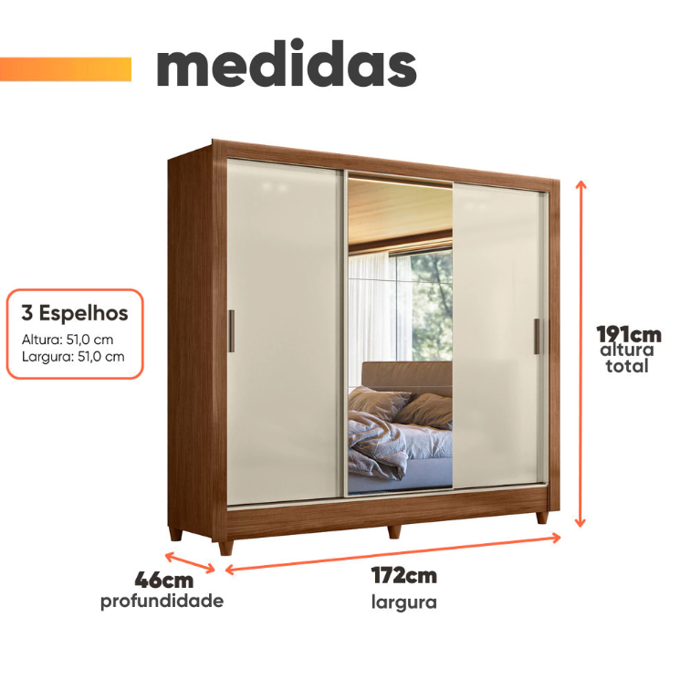 Guarda Roupas Casal com Espelho 3 Portas de Correr 2 Gavetas França - Santos Andirá