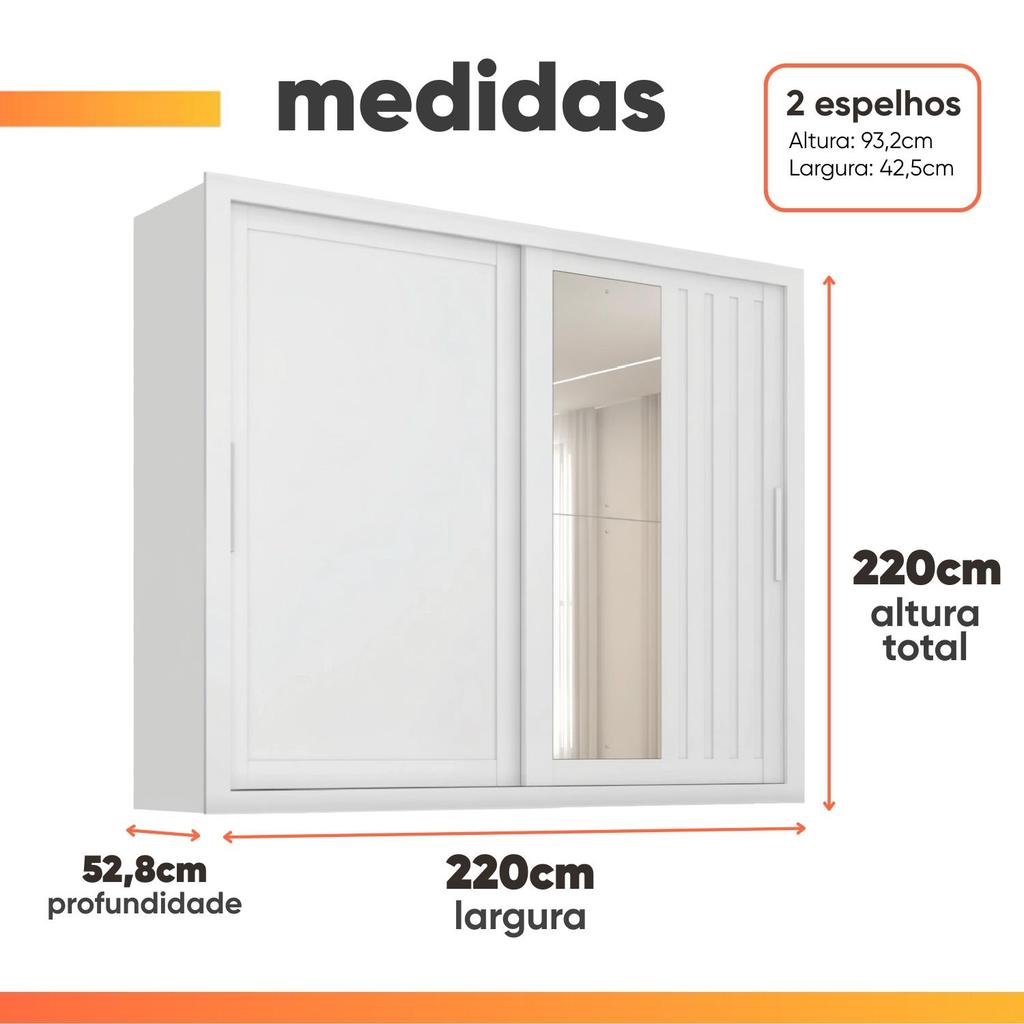 O Guarda Roupas Trianon foi desenvolvido para quem busca sofisticação, praticidade e melhor aproveitamento do espaço. Possui duas portas de correr, sendo uma delas com amplo espelho, proporcionando um visual moderno e elegante. Seu interior é bem distribuído e conta com quatro gavetas com corrediças telescópicas, garantindo abertura suave e maior conforto no uso diário. As duas primeiras gavetas possuem divisões internas, ideais para manter seus itens pessoais sempre organizados. Além disso, conta com puxadores em MDF, proporcionando um toque moderno e maior durabilidade. Aposte na combinação perfeita entre elegância e eficiência e transforme seu ambiente! MEDIDAS: A = 220 cm L = 220 cm P = 52,8 cm MEDIDAS DO ESPELHO (cada um): A = 93,2 cm L = 42,5 cm P = 0,3 cm PESO: 157,6 kg PESO SUPORTADO: 44 kg GAVETAS SUPORTAM ATÉ: 3 kg PRATELEIRAS SUPORTAM ATÉ: 4 kg CABIDEIROS SUPORTAM ATÉ: 5 kg MODELO: Guarda Roupas Casal com Espelho 2 Portas de Correr 4 Gavetas Trianon MARCA: Zanzini TIPO DE PINTURA: Semi Fosco ACABAMENTO: UV Verniz MATERIAL: MDP ESPESSURA DO MATERIAL: 12mm PORTAS: 2 (Portas de correr) GAVETAS: 4 PRATELEIRAS: 2 QUANTIDADE DE CABIDEIROS: 3 CABIDEIROS: Metálicos CORREDIÇAS: Telescópicas PUXADORES: MDF QUANTIDADE DE PUXADORES: 2 ESPELHO: Sim (2 Lâminas) GARANTIA: 3 Meses DIFERENCIAL: Portas de correr / Puxadores em MDF / Corrediças telescópicas que proporcionam deslize suave / Amplo espelho SISTEMA DE MONTAGEM: Parafusos auto atarraxantes, cola, cavilhas, pregos Importante sobre a entrega: A entrega é realizada até a portaria ou porta de entrada do endereço indicado, desde que o acesso seja permitido. Para locais com portaria, a entrega será feita no piso térreo. Não realizamos montagem, desmontagem, transporte por escadas ou içamento. É responsabilidade do cliente verificar se as dimensões do produto são compatíveis com portas, elevadores e corredores. Evite imprevistos: confira todos os detalhes antes de concluir sua compra.