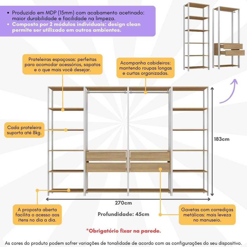 Transforme o seu espaço com o Guarda-Roupas Closet Modulado 270cm 4 Peças com 4 Gavetas e Cabideiros Multimóveis MP4321 e experimente a liberdade máxima de organização pessoal! Cada detalhe deste closet oferece não só beleza, mas também funcionalidade e durabilidade incríveis. Durabilidade e funcionalidade: Produzido em MDP de 15mm com acabamento acetinado (cerca de 20% de brilho), este móvel entrega sofisticação e resistência para o seu dia a dia. Composto por 4 módulos individuais, permite que você monte da forma que melhor se adaptarem ao seu ambiente, proporcionando flexibilidade total ao seu jeito de viver. Amplo espaço interno e elegância: O closet é equipado com 14 prateleiras espaçosas (suportam até 8kg em cada), ideais para acomodar suas roupas e calçados favoritos com estilo e organização inigualáveis. Os cabideiros de madeira revestidos garantem que suas roupas, sejam longas ou curtas, fiquem sempre impecáveis. Além disso, com 4 gavetas que possuem corrediças metálicas, o manuseio dos seus pertences ganha leveza e praticidade. Valorize cada peça do seu vestuário com um design aberto e moderno que realça qualquer espaço. Conteúdo da Embalagem: 2 (dois) Módulos com Prateleiras 62cm 2 (dois) Módulos com Gavetas e Cabideiro 73cm Manual de Montagem Kit Ferragem Especificações Técnicas: Dimensões do Produto Montado - Altura: 183cm | Largura: 270cm | Profundidade: 45cm Material: MDP 15mm Acabamento: Acetinado Quantidade de Prateleiras: 14 Quantidade de Gavetas: 4 Corrediças: Metálicas *Você pode consultar as medidas detalhadas na imagem técnica do produto. *As cores dos produtos podem sofrer variações de tonalidade de acordo com as configurações do seu dispositivo. *Obrigatório fixar o móvel na parede. Aqui na Loja Multimóveis, você pode concluir sua compra facilmente com toda segurança. A entrega é garantida e aqui você está em 1° lugar. Imagem meramente ilustrativa. Decoração não acompanha o produto. Os produtos serão entregues desmontados e não disponibilizamos o serviço de montagem.