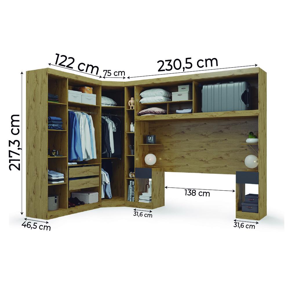O Guarda Roupas Modulado Genova Plus vai deixar seu ambiente ainda mais sofisticado! Conta com 6 portas, sendo duas de correr, 2 gavetas com amplo espaço, 2 mesas de cabeceira e módulo de canto com nichos espaçosos. Acomoda cama de até 1,38m. Ideal para quem busca praticidade e modernidade. MEDIDAS LADO DIREITO: [ A ] = 217,3 cm [ L ] = 230,5 cm [ P ] = 46,5 cm MEDIDAS LADO ESQUERDO: [ A ] = 217,3 cm [ L ] = 122 cm + 75 cm (Módulo Canto) [ P ] = 46,5 cm CABIDEIROS SUPORTAM ATÉ: 5 kg PRATELEIRAS SUPORTAM ATÉ: 5 kg GAVETAS SUPORTAM: 2kg Externas / 5 kg Internas PESO: 259,4 kg MODELO: Guarda Roupas Modulado com Cabeceira de Casal Genova Plus 6 Portas 4 Gavetas MARCA: Batrol COR: Ypê / Grafite ACABAMENTO: Pintura UV MATERIAL: MDP 15 E 12mm PORTAS: 6 DOBRADIÇAS: Metálicas de Pressão MATERIAL DOS PUXADORES: PVC GAVETAS: 4 CORREDIÇAS: Metálicas PRATELEIRAS: 14 NICHOS: 7 CABIDEIROS: 3 MATERIAL DOS CABIDEIROS: Alumínio GARANTIA: 3 meses A Esplanada Móveis se responsabiliza pela entrega dos produtos adquiridos até a porta de entrada ou portaria do endereço indicado, se a portaria do condomínio permitir, as entregas são efetuadas no piso térreo e é de responsabilidade do cliente a locomoção da mercadoria até seu apartamento ou casa. Confira as dimensões do produto e certifique-se de que estão adequadas aos elevadores, portas e corredores do local da entrega. Não fazemos a montagem, desmontagem do produto e/ou portas e janelas, transporte pela escada ou içamento pelo lado de fora do prédio. Não está incluso no serviço de entrega o deslocamento até o interior do apartamento, com ou sem elevador, ou deslocamento em locais de difícil acesso como escadarias