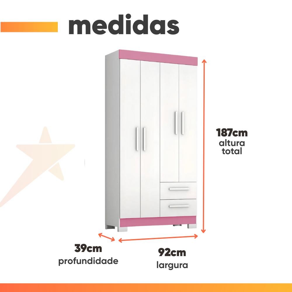 Guarda Roupas Solteiro Juvenil 4 Portas 2 Gavetas Malta Branco / Rosa Notável